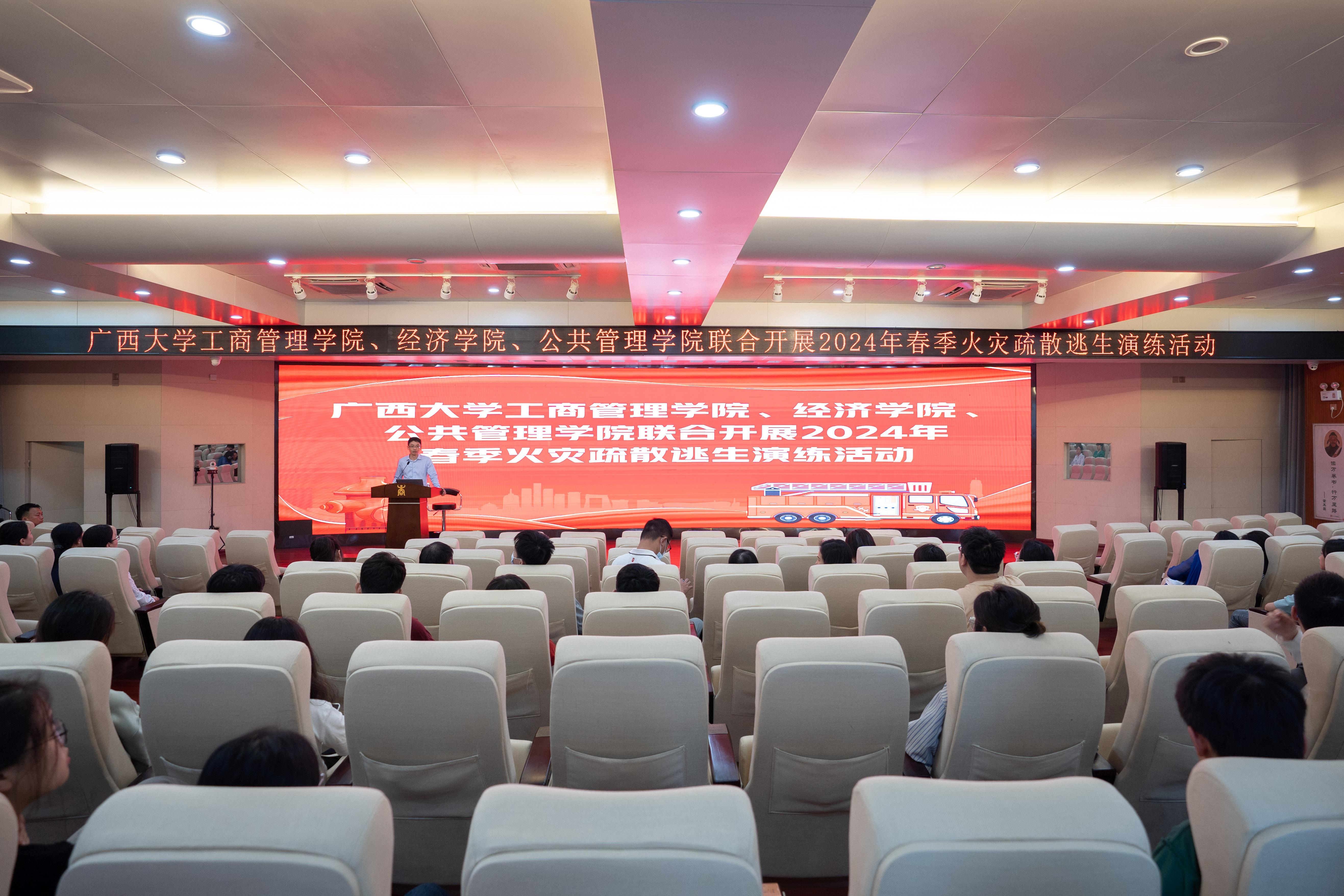 与经济学院/中国-东盟金融合作学院、公共管理学院联合开展2024年春季消防安全培训及演练活动。学校保卫处消防安全管理岗负责人黄光电老师及工作人员来到现场指导工作,三院师生代表共170余人参加活动。色中色