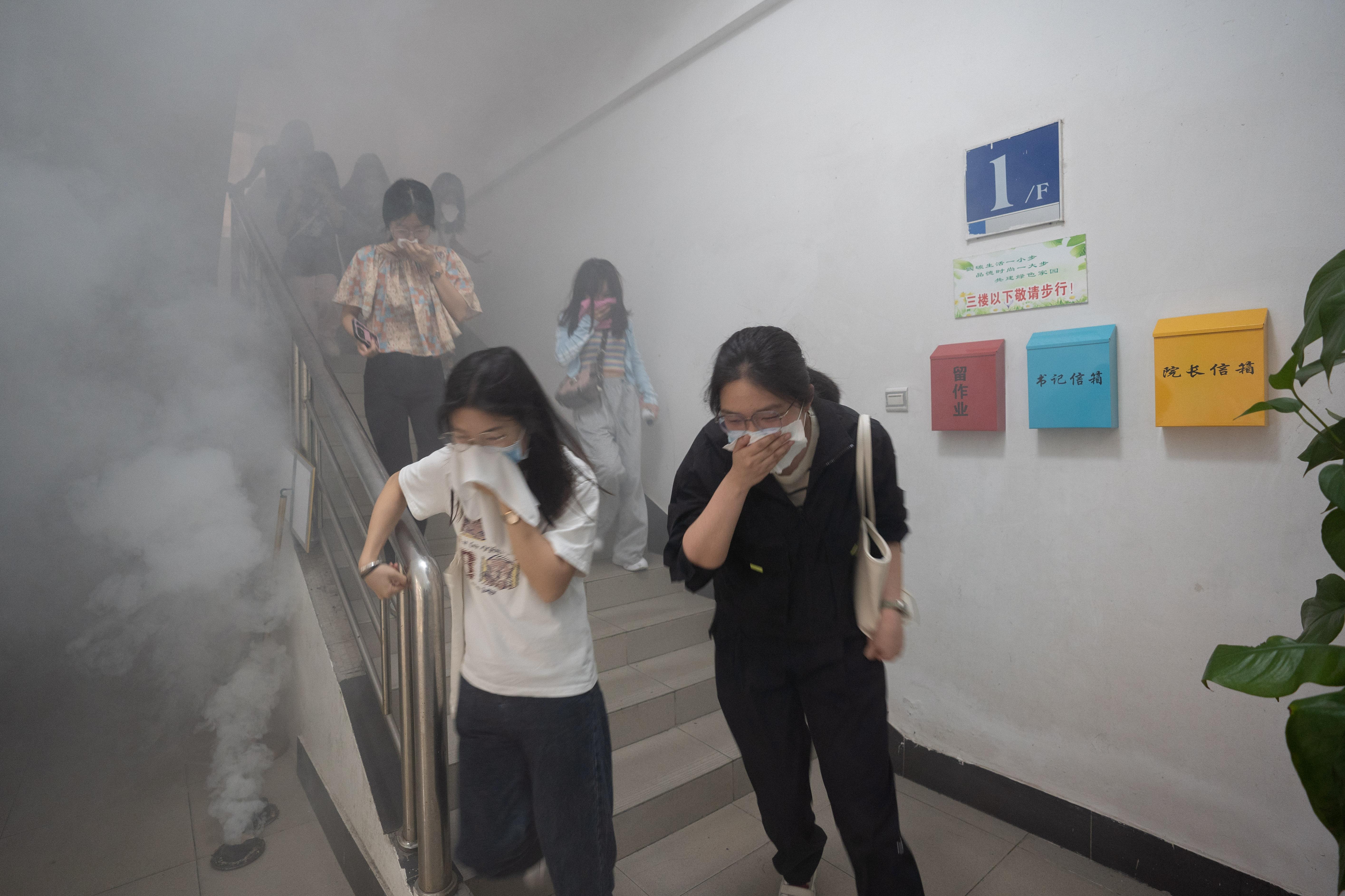 演练现场,伴随着消防警报声响起,参加火灾疏散逃生演练的师生在烟雾中用湿毛巾捂住口鼻,采取低姿势行走,在保卫处工作人员的引导下迅速有序撤离,顺利完成演练。