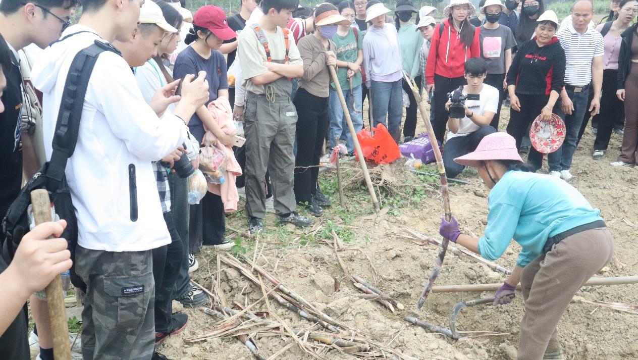 劳动结束,同学们进行了甘蔗产业实地调研。暮定村那界屯土地多为纱质土壤,适合发展黑皮果甘蔗种植业,果蔗种植是暮定村“一村一品”建设的重要推手,今年村民种植各类果蔗约400亩,收到达1000万元,是当地村民的主要收入来源。村民表示,能过上现在的好日子,全靠党和国家对乡村振兴的大力支持,通过实用技术培训、按时按量发放补贴、疏通那界支渠等有效措施,解决了产业发展的痛点和堵点,促进了甘蔗产业链日趋完善,加速形成了相关产业的新业态,切实推动了广西乡村特色产业高质量发展。