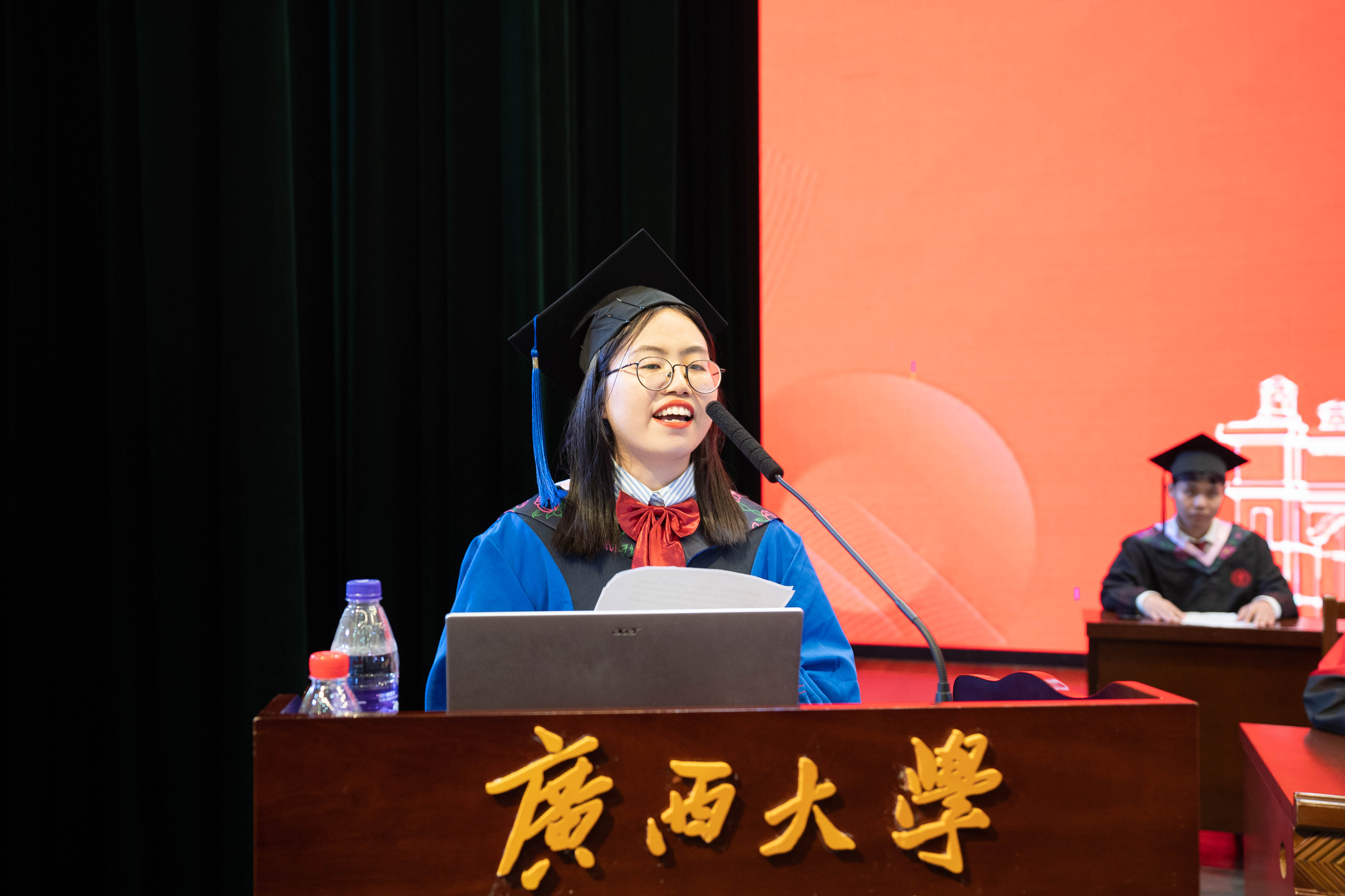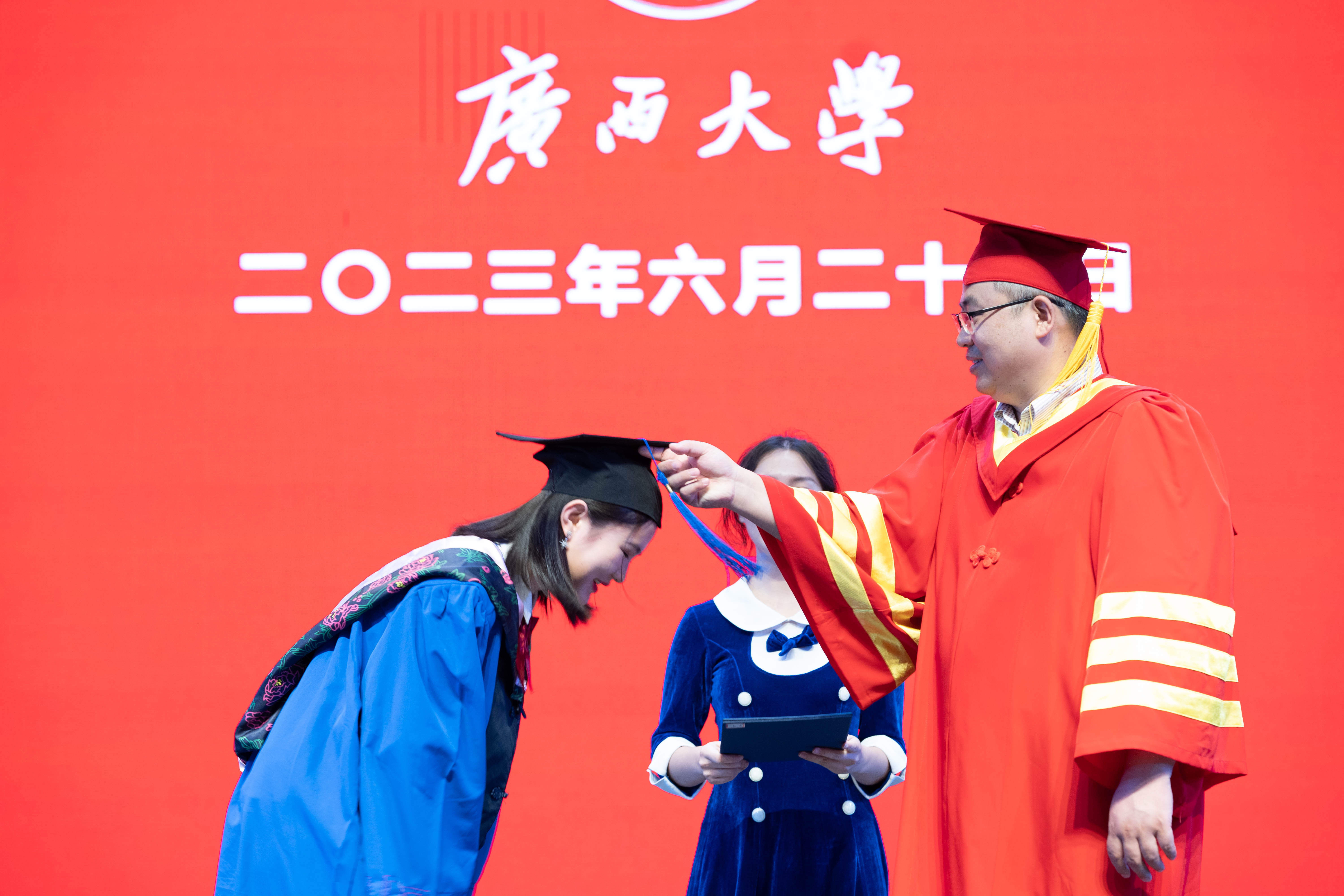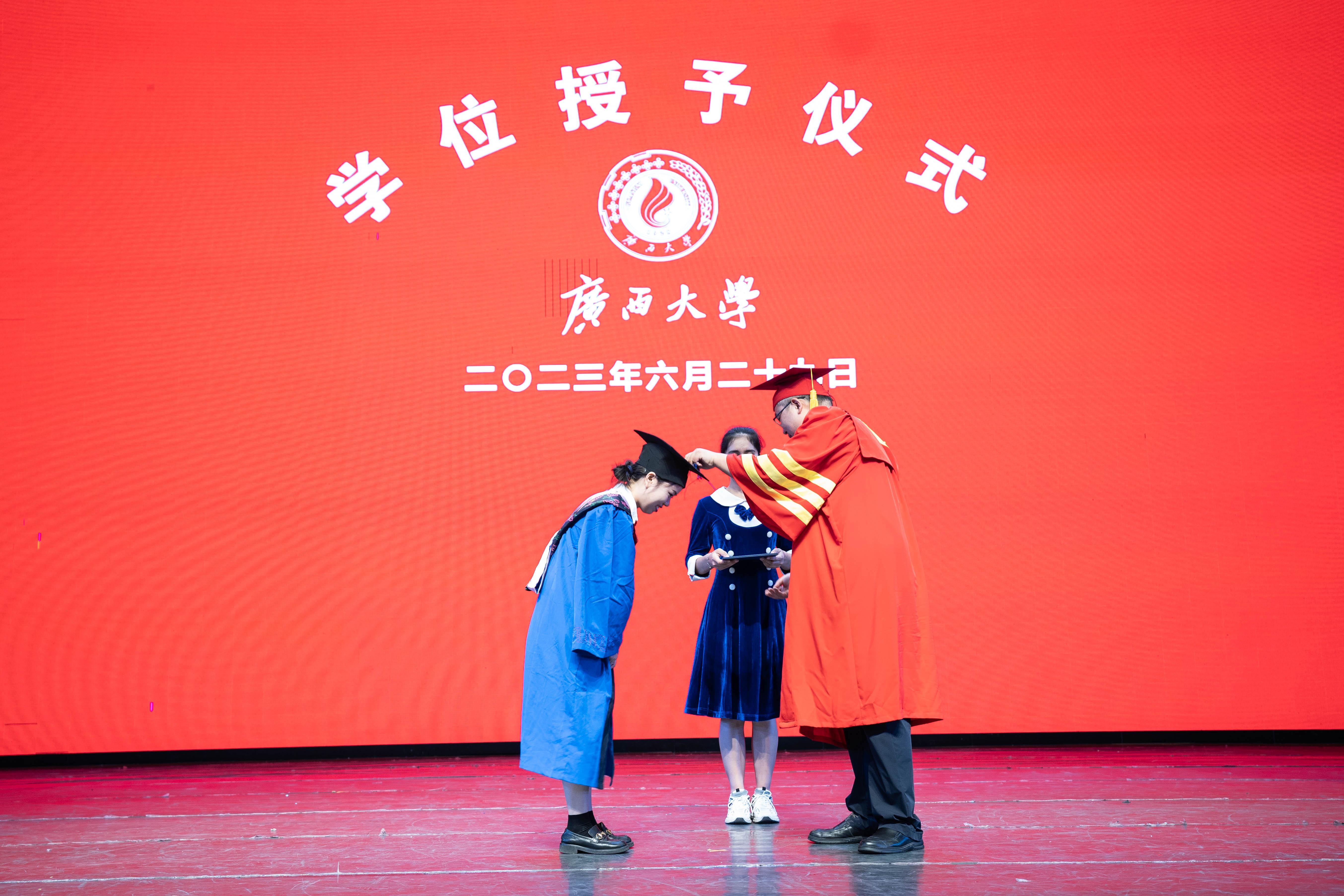 在雄壮激昂的国歌奏唱中,本届毕业典礼暨学位授予仪式拉开帷幕。学院党委书记罗诚为获得广西普通高等教育优秀毕业生、色中色