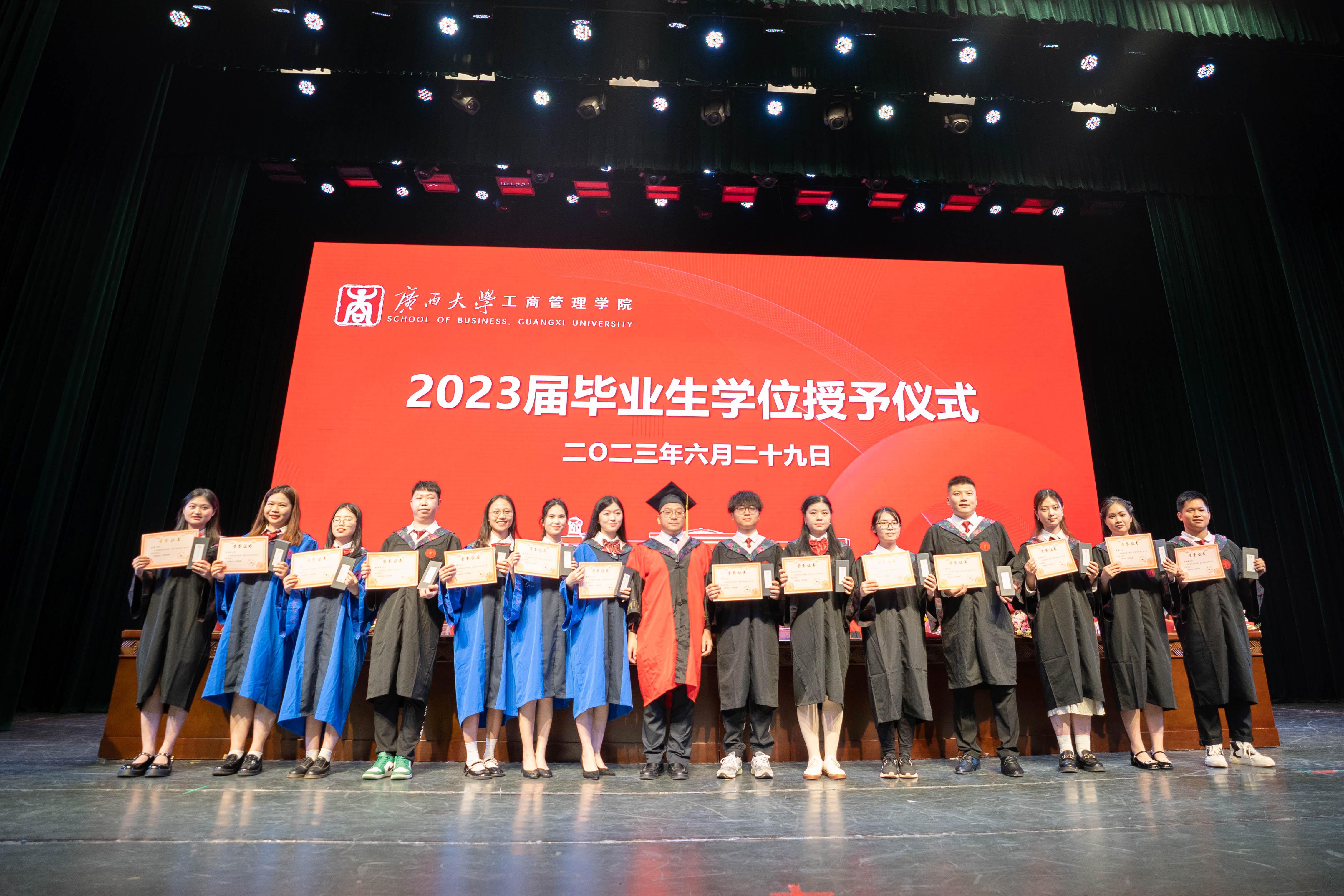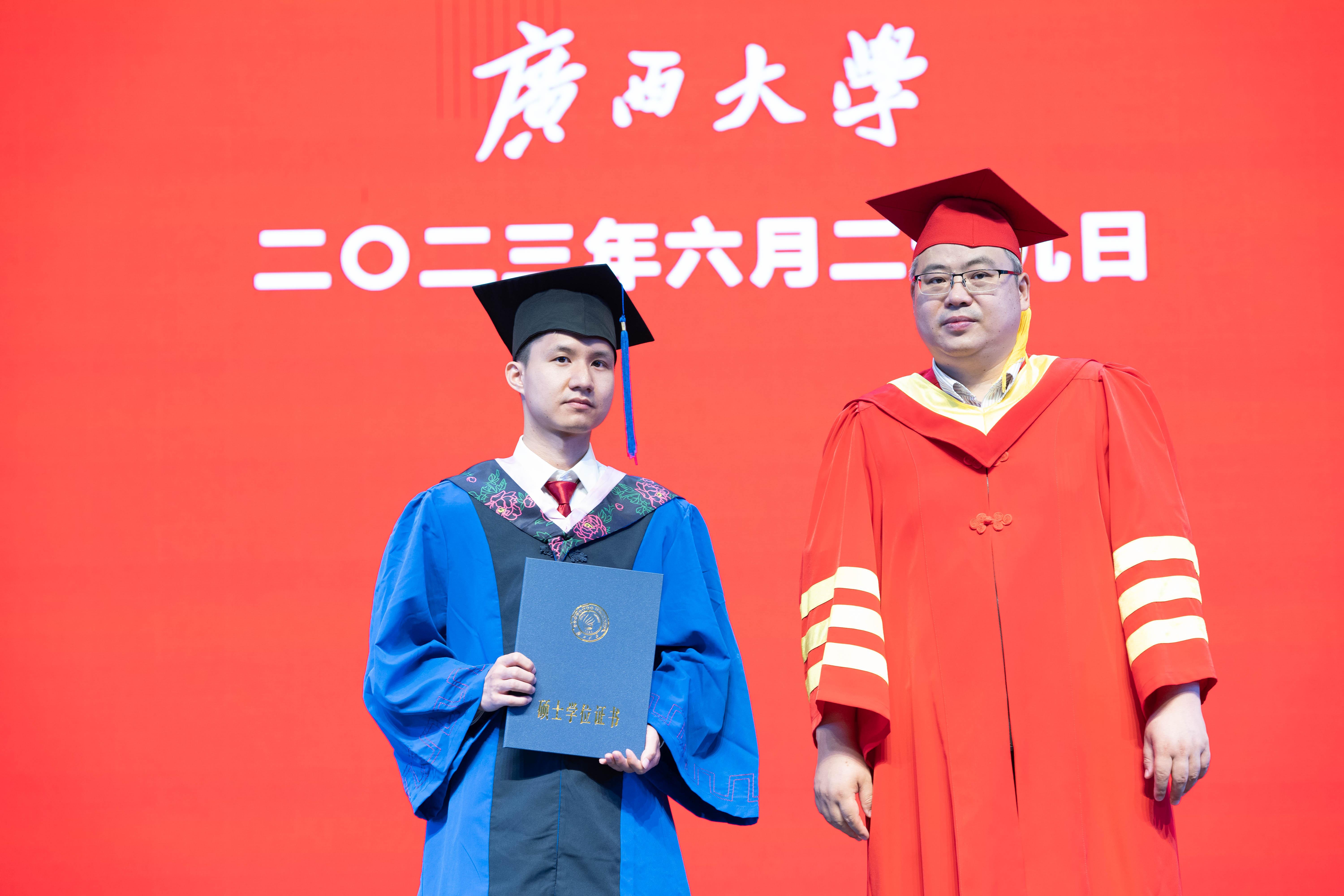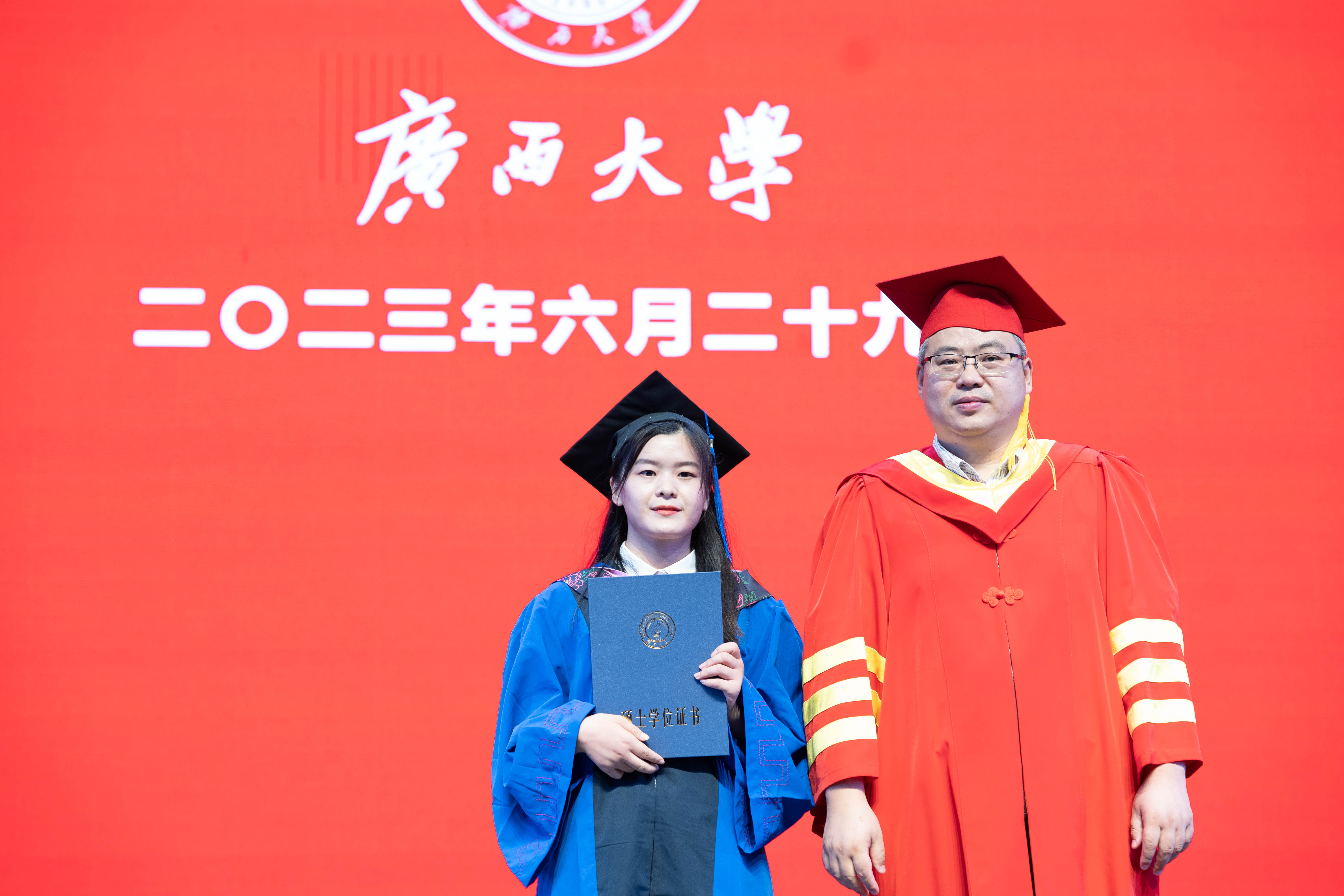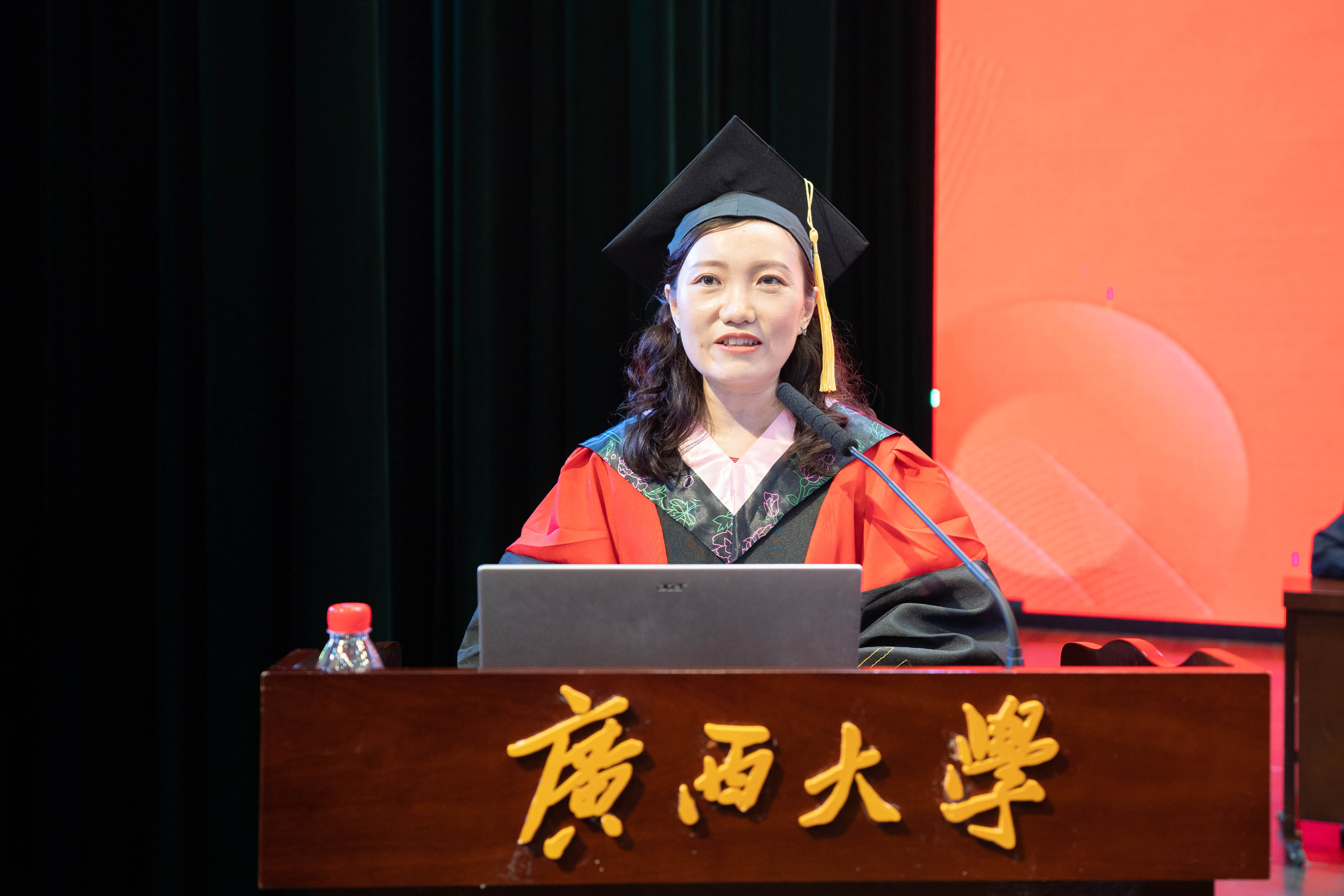 在雄壮激昂的国歌奏唱中,本届毕业典礼暨学位授予仪式拉开帷幕。学院党委书记罗诚为获得广西普通高等教育优秀毕业生、色中色