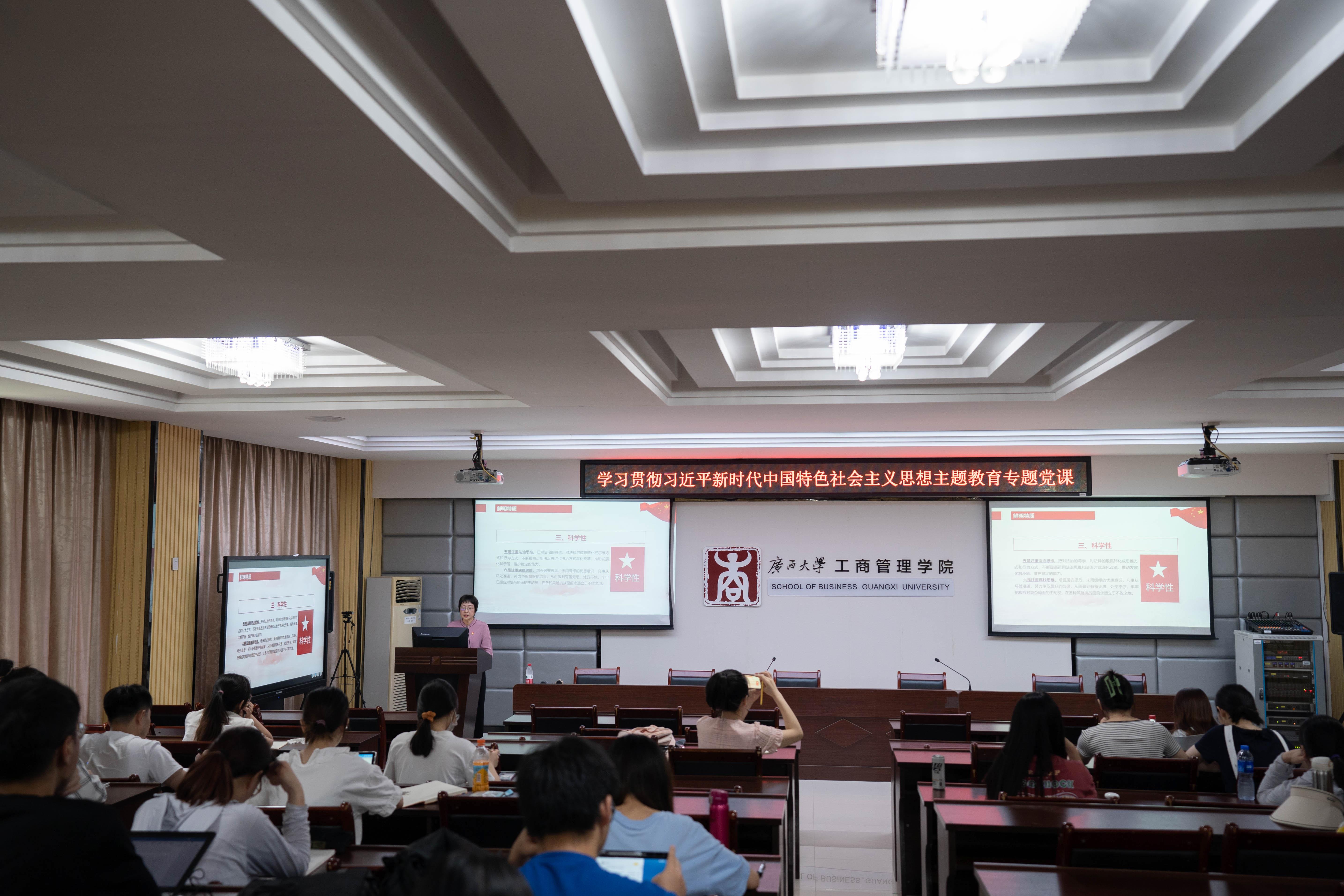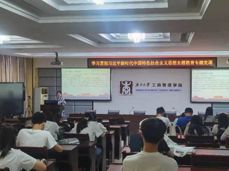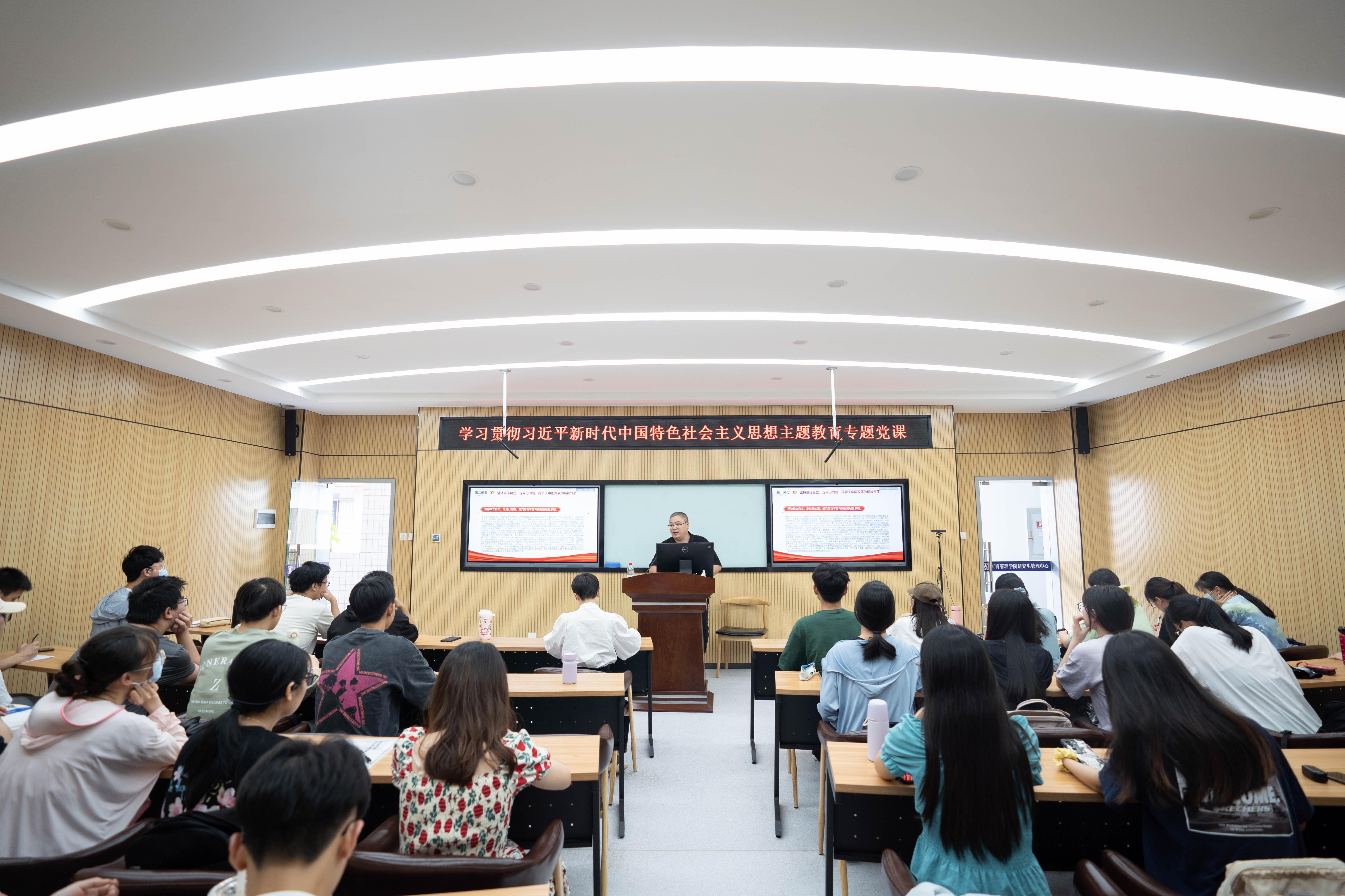 学院副院长廖东红以《学习贯彻习近平新时代中国特色社会主义思想》为题,在学院124报告厅为研究生第一党支部和本科生第四党支部讲授专题党课,她就习近平新时代中国特色社会主义思想主题教育概述、主要内容以及鲜明特质进行了阐述。她号召大家以主题教育为契机,深入学习贯彻党的二十大精神,努力把学院建成“区域有品牌,国内有特色,国际有影响”的新时代高水平色中色