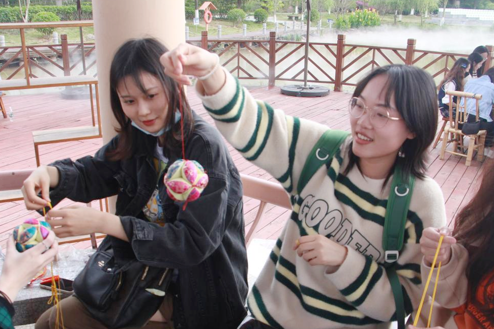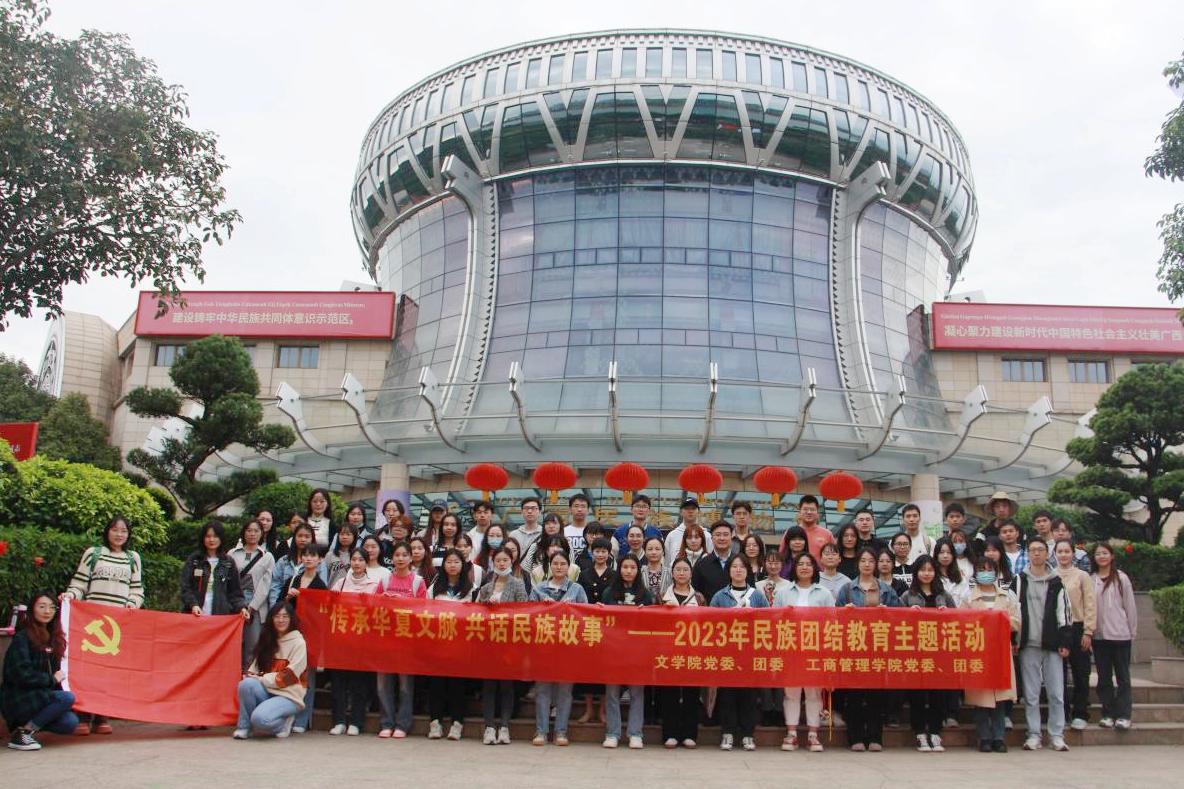 等7个党/团支部共计约80人赴广西民族博物馆,通过实地教学的方式加深学习广西民俗文化知识。在壮族文化展厅和五彩八卦文化陈列馆,师生们认真听取讲解员介绍壮族的分布和文字、建筑风格、祖先祭祀、农业、纺织业以及民族服饰等,感受壮锦、铜鼓、绣球等壮族文物的魅力。在民族村小舞台,支部组织同学分发壮族五色糯米饭和绣球半成品制作包,同学们分为8个小组一边品尝五色糯米饭,一边沉浸式体验绣球制作。