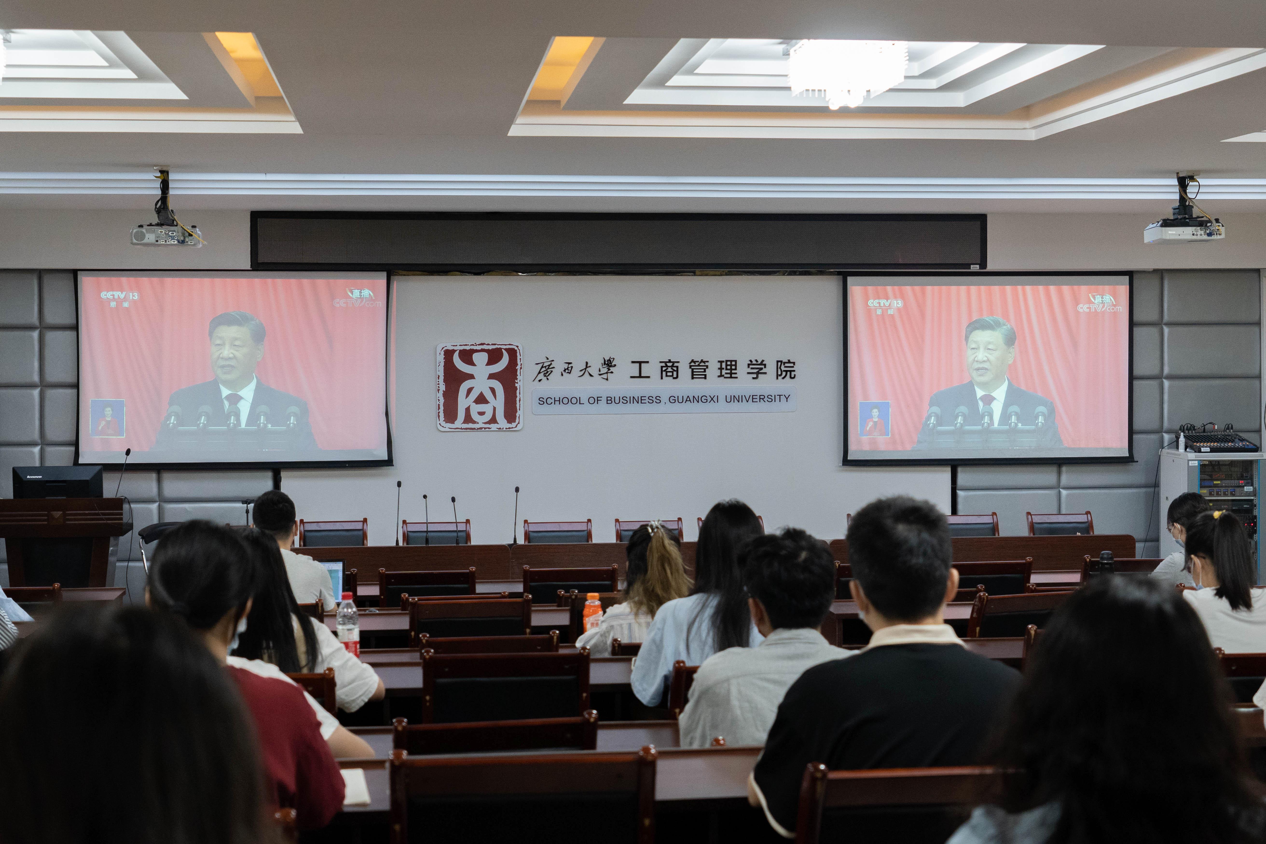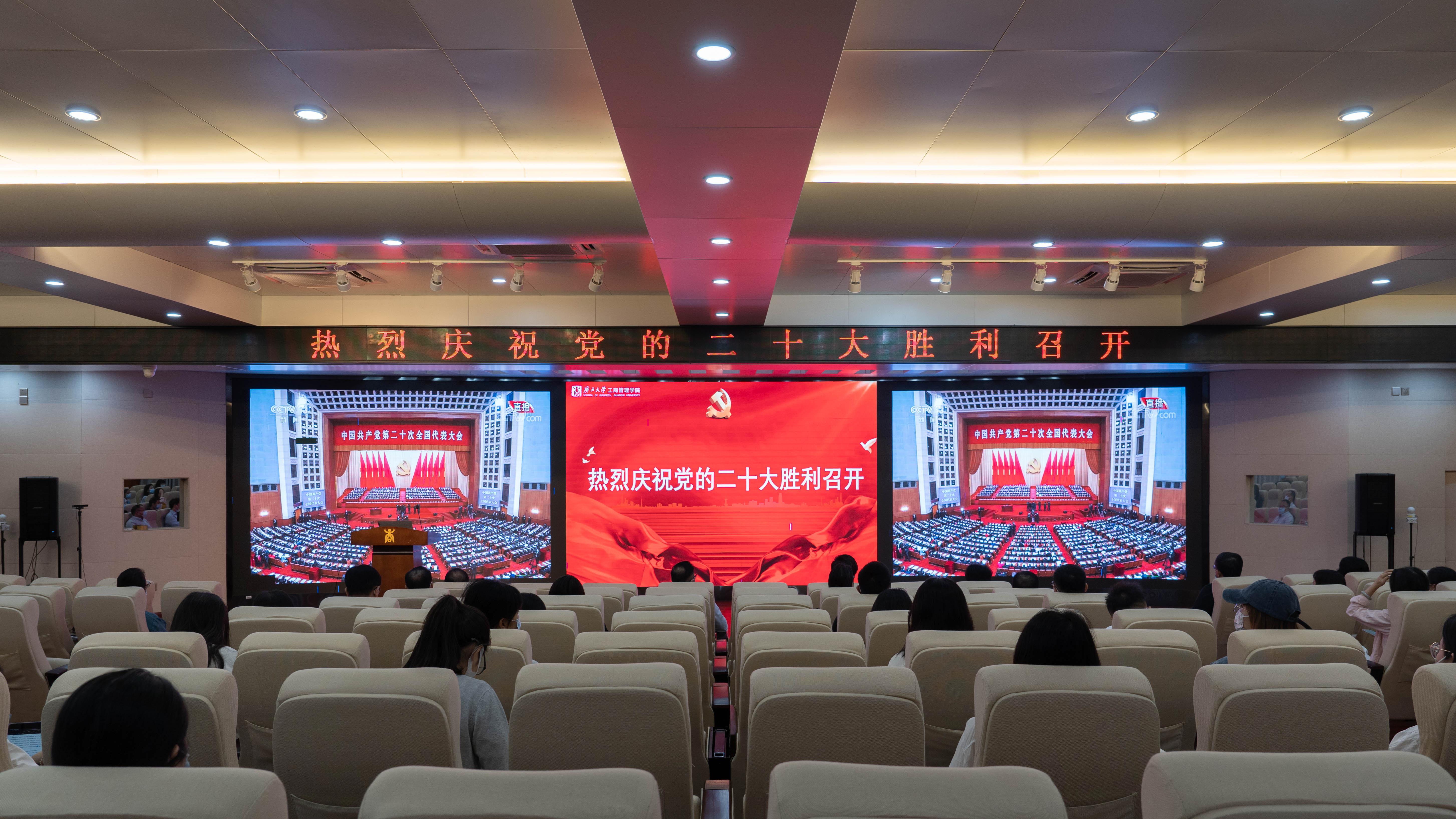 128报告厅、124教室,学院党员干部、师生代表集中收看开幕会盛况,其余师生自发在办公室、在寝室、在家等场所,通过电视、网络、广播等渠道认真收看收听党的二十大开幕盛况。