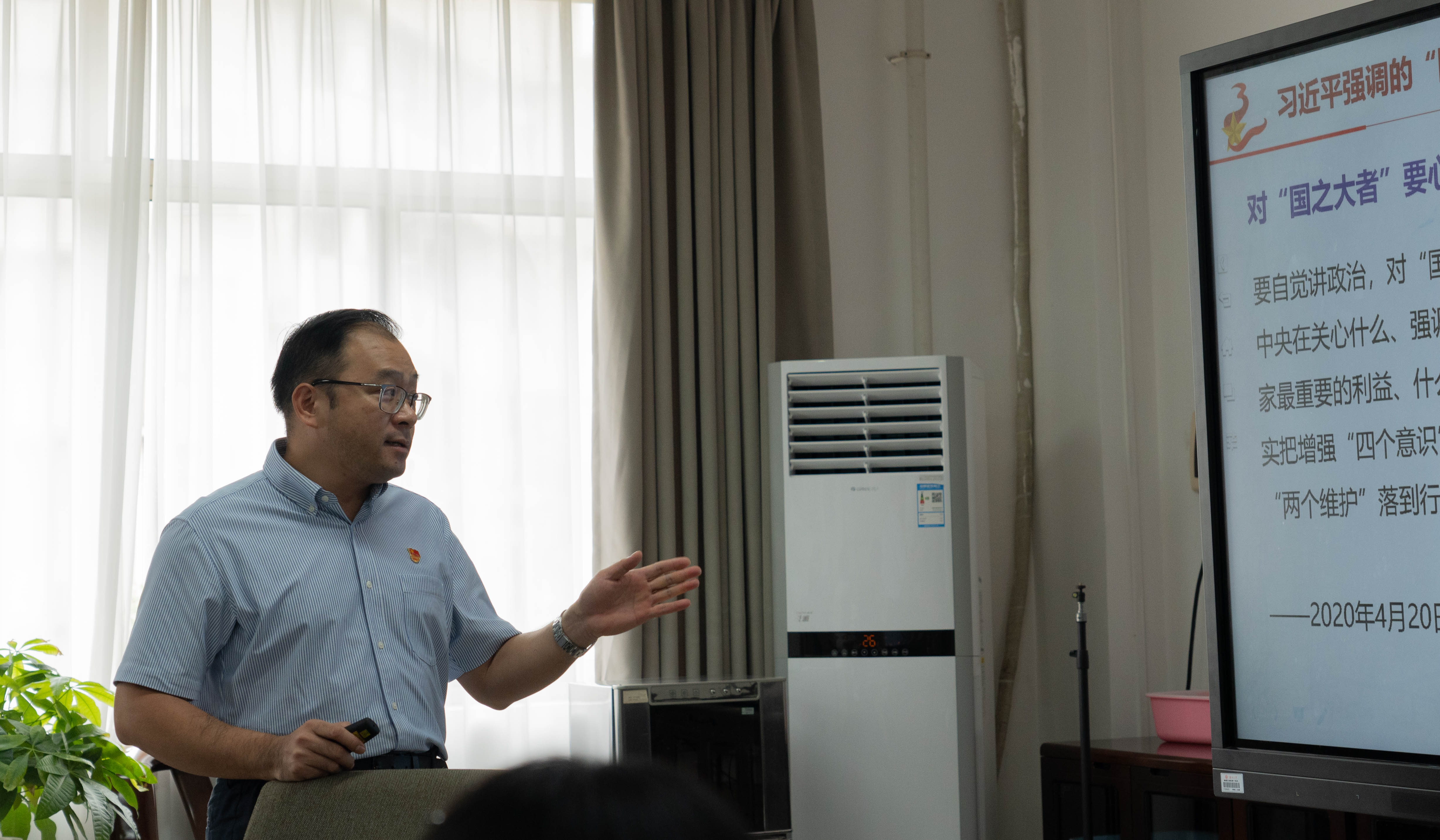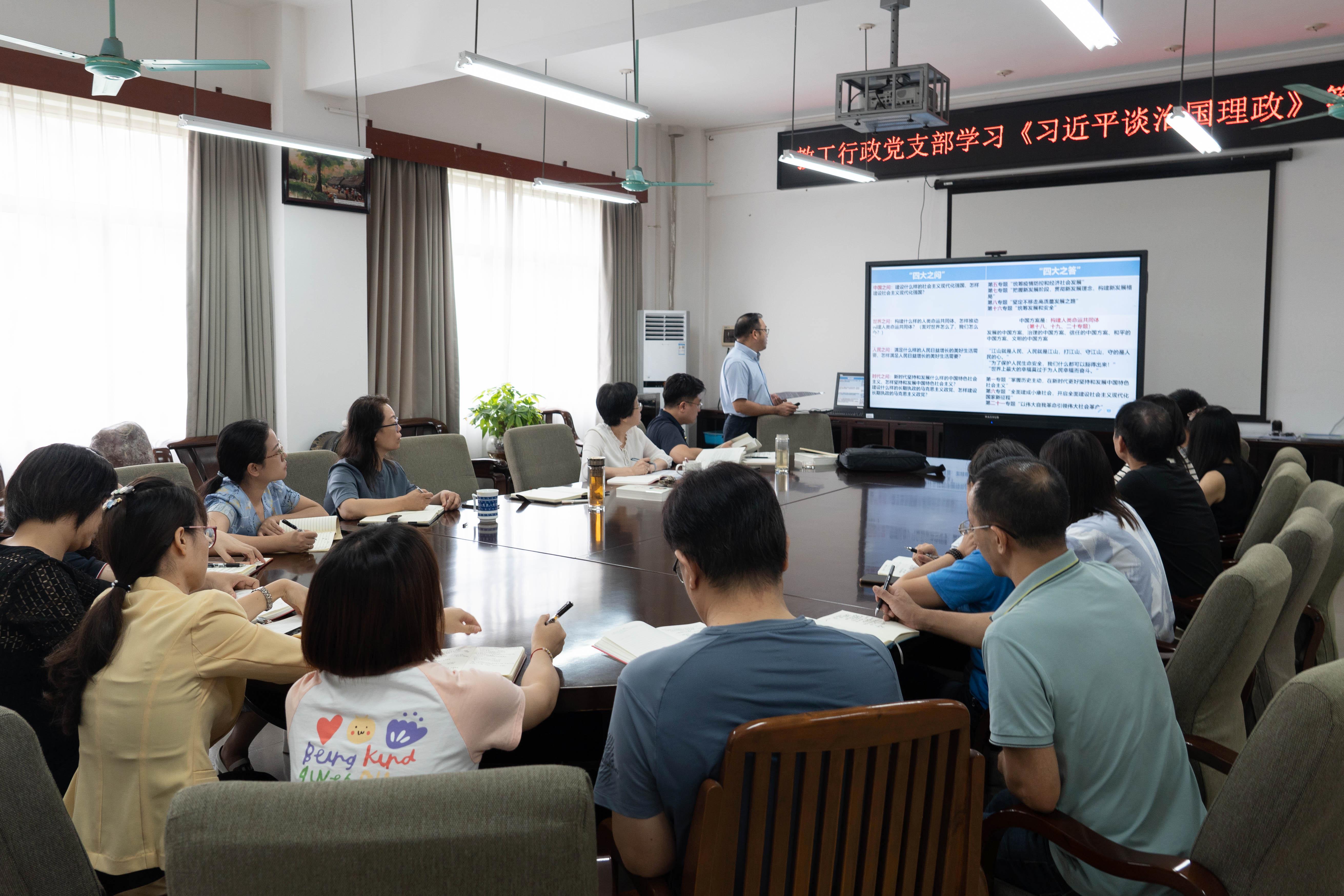 党委书记罗诚在学院420会议室给教工行政党支部全体党员讲授专题党课,领学《习近平谈治国理政》第四卷。