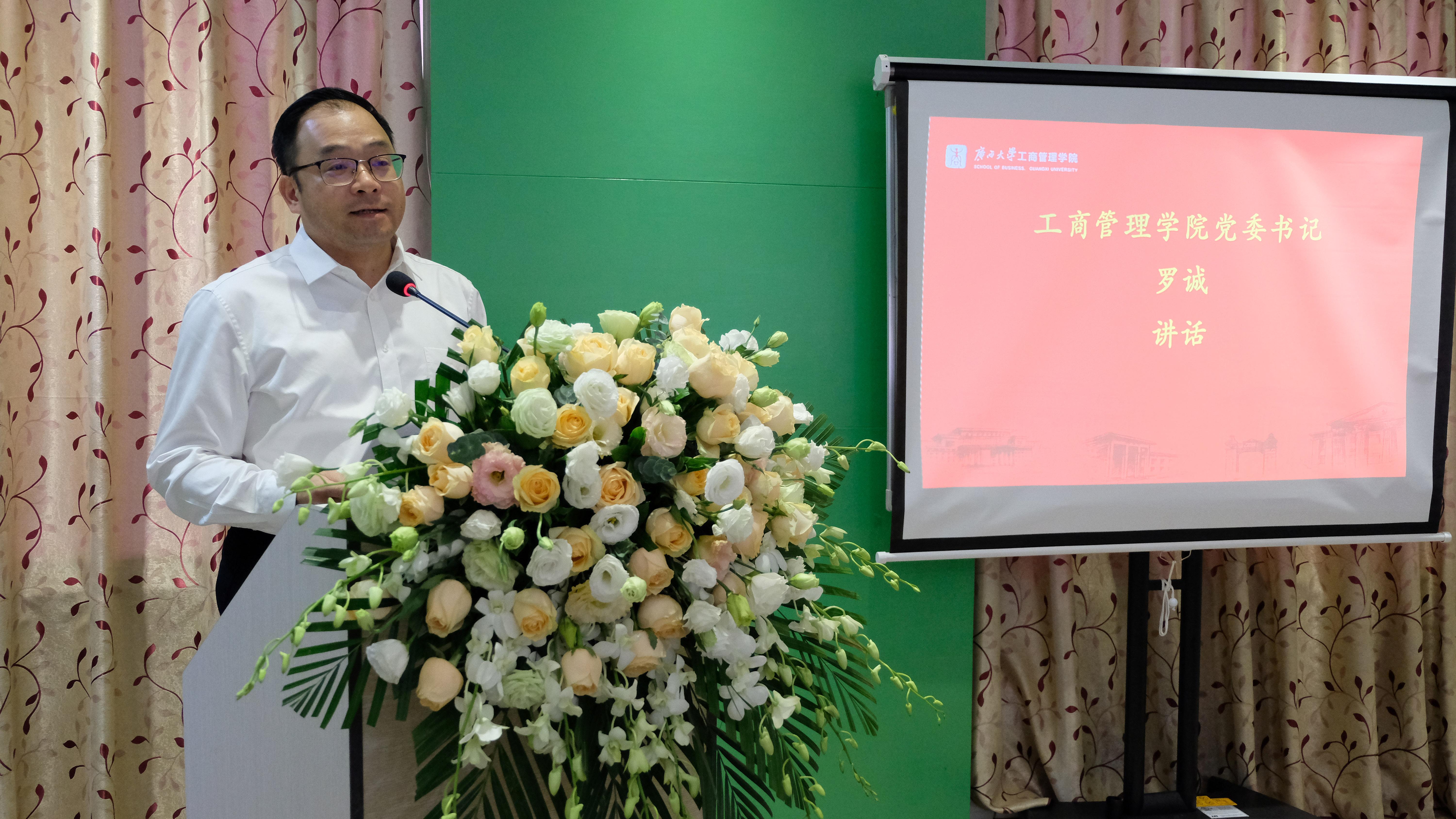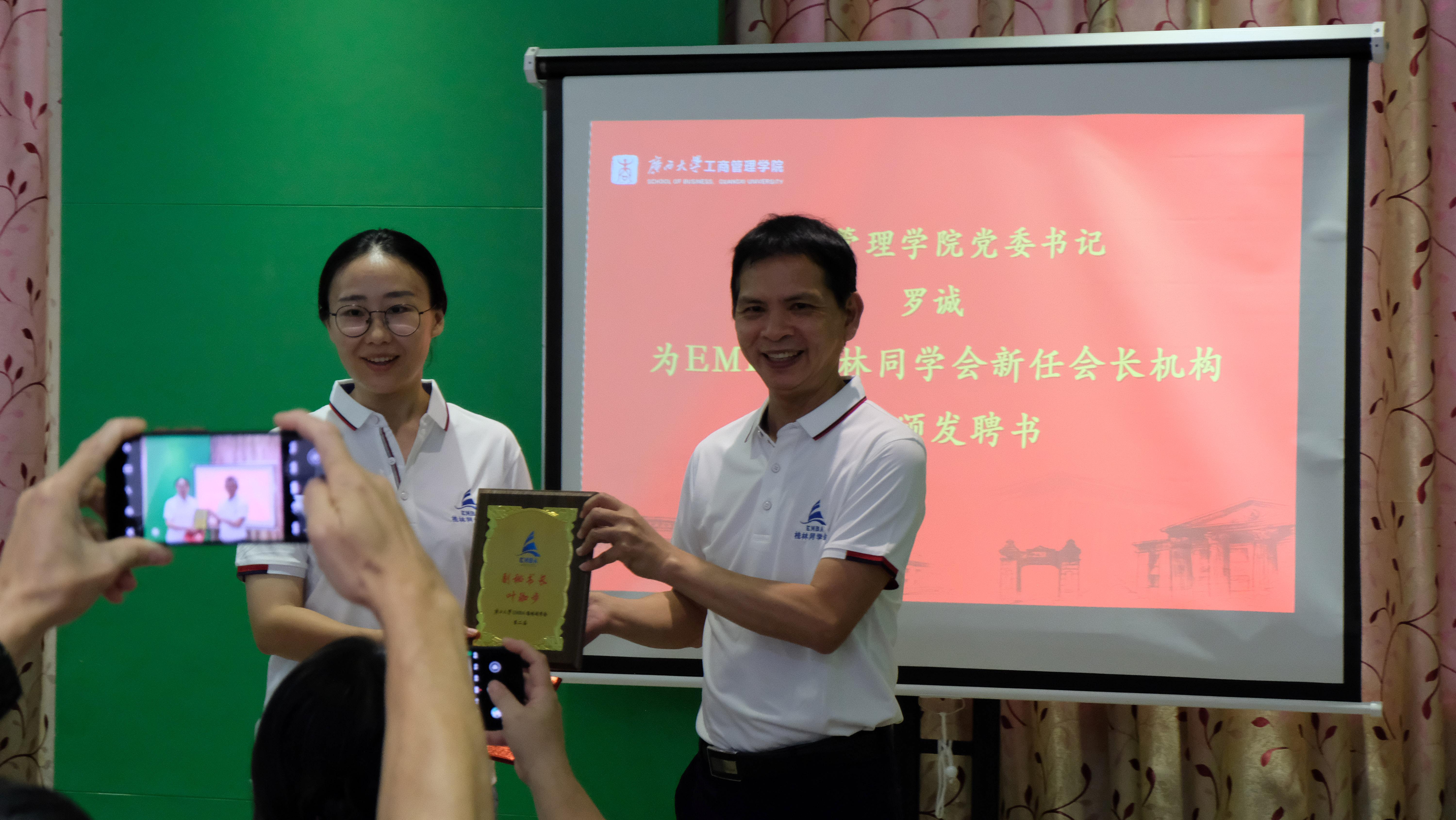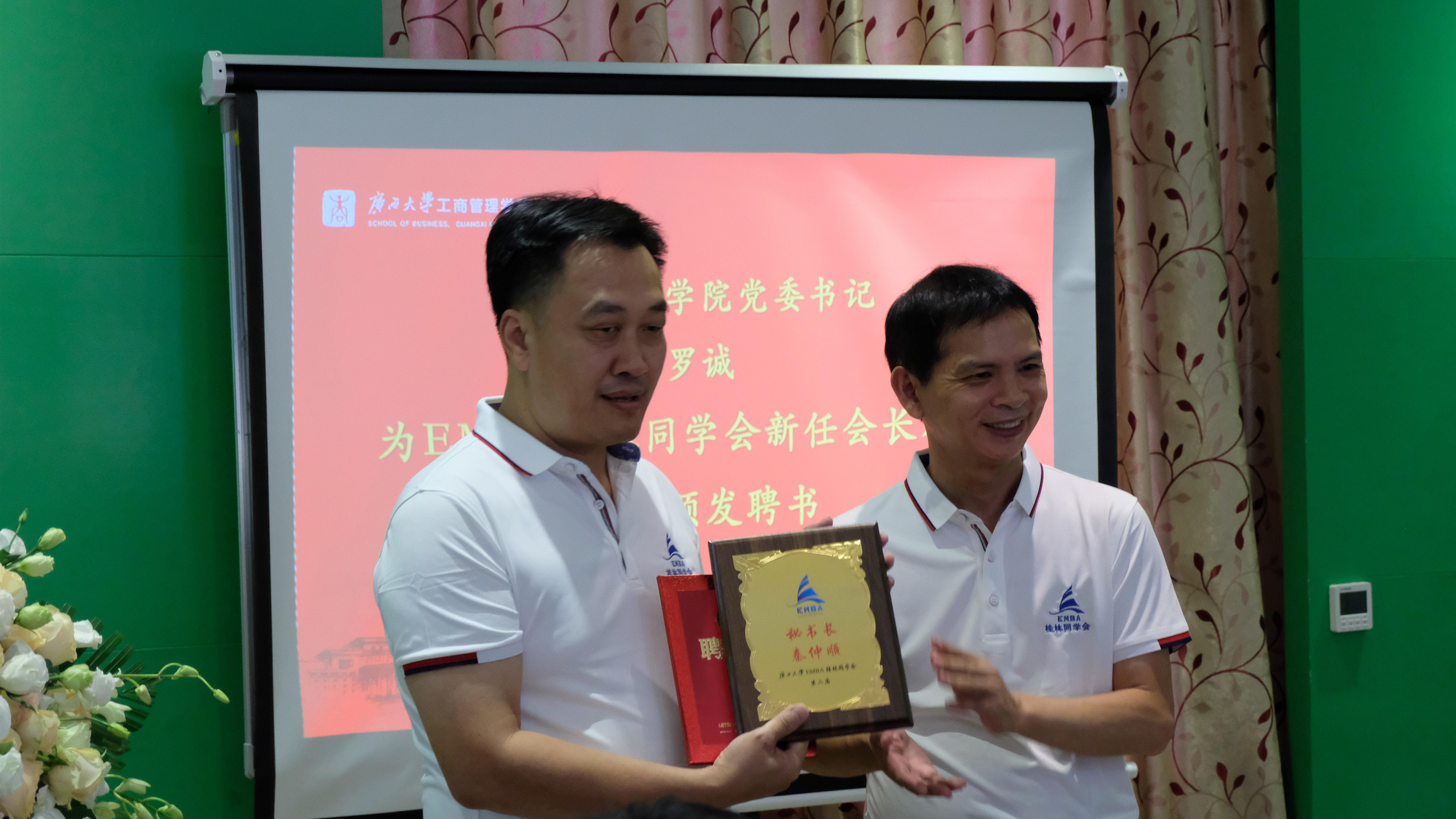 他期望EMBA桂林同学会在新一届会长江源涌的带领下,充分发挥联络校友、联系学院母校、服务社会的职能,为学院学校的建设和发展建言献策;期望各位校友在这个平台上,能进一步加深了解、增强互信、互相帮助、团结协作,让校友会成为大家共同的家园。最后,罗书记代表学院诚挚地邀请各位校友常回学院母校,共叙师生情、同窗情、校友情。