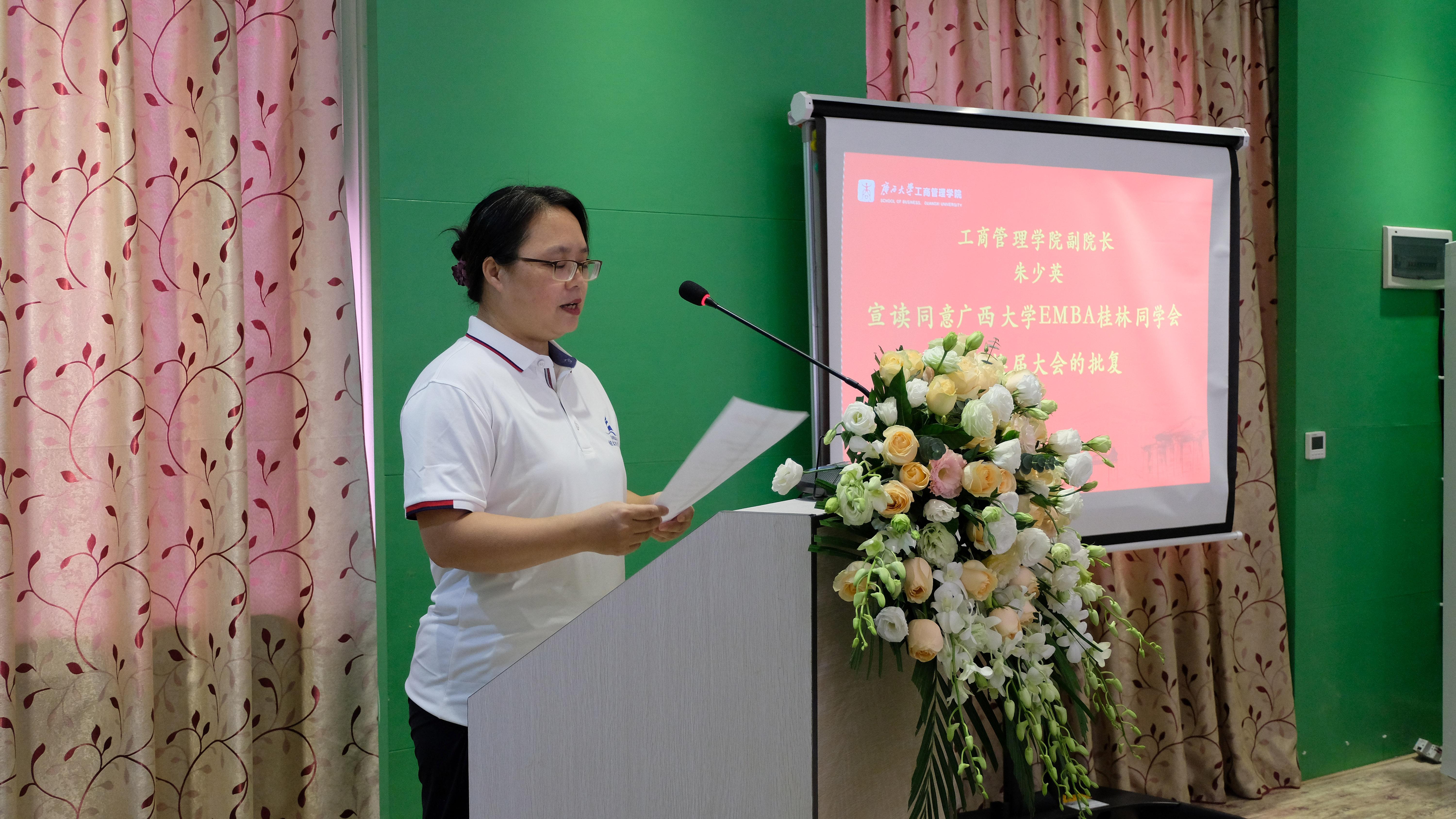 党委、行政向大会的成功举办表示热烈的祝贺。在会上,罗书记简要介绍了学院的新发展、新变化以及近期取得的新成就,并对EMBA桂林同学会开展的一系列细致而又卓有成效的工作表示了充分的肯定,向一直以来为学院发展建设、人才培养和就业创业等提供了有力支持的校友们表示衷心的感谢。