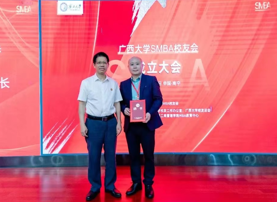 党委常委、总会计师、校友总会常务副会长宁旭初(左)为SMBA校友会会长莫兴锋颁发聘书