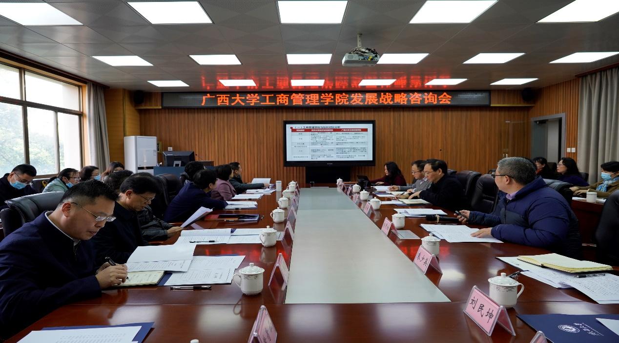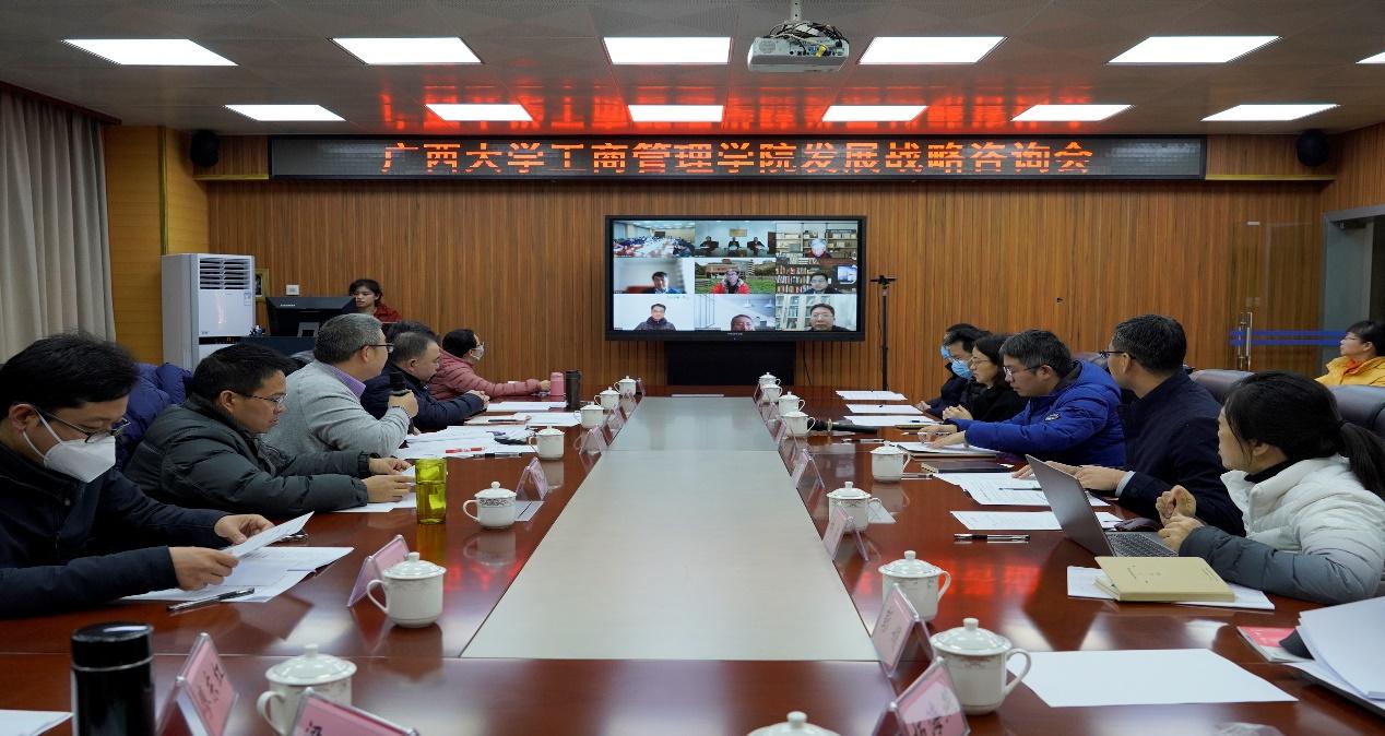 在学院315会议室以线上和线下的形式召开学院发展战略研讨会。南京大学工程管理学院名誉院长、原东南大学副校长盛昭瀚,首都经济贸易大学副校长王永贵教授,北京理工大学管理与经济学院院长王兆华教授,南开大学商学院原院长张玉利,中山大学管理学院原书记谭劲松,北京师范大学教授陈彬,中山大学旅游学院教授张朝枝等专家领导应邀在线上指导;广西壮族自治区政府发展研究中心党组书记、主任杨丛,百色学院党委书记唐拥军,广西教育学院党委书记、院长袁旭,广西电力职业技术学院校长李向红,广西财经学院副校长夏国恩,广西壮族自治区教育厅科研管理处处长黄青云,色中色