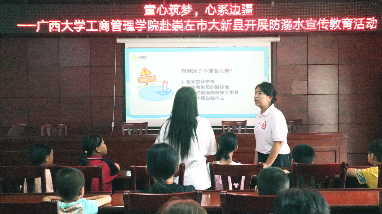 实践团成员通过播放安全生动的宣传短片、深入浅出地讲解防溺水知识,特别是重点讲解了防溺水“六不准”与“四个牢记”的要点,以及溺水自救的五种方法,让孩子们在轻松愉快的氛围中掌握了关键的自救互救技能。有奖问答的互动环节更是激发了孩子们的热情,让防溺水知识深入孩子心中。