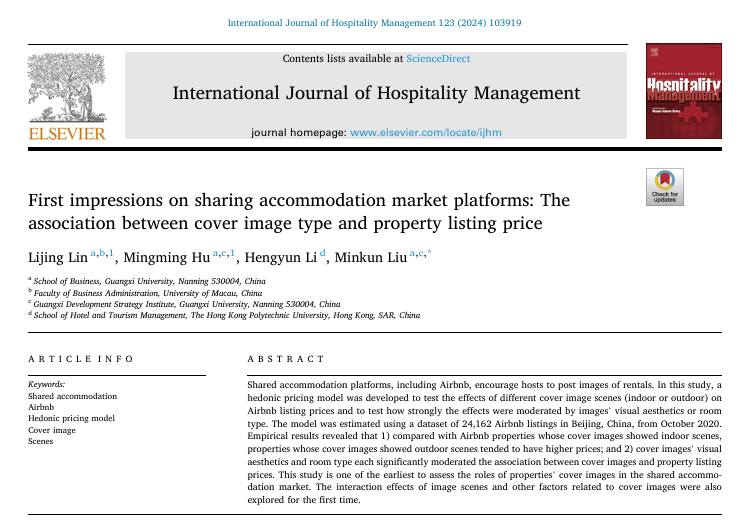 胡明明副教授、刘民坤教授、硕士研究生林丽晶与香港理工大学李恒云副教授合作研究成果《First impressions on sharing accommodation market platforms: The association between cover image type and property listing price》,在旅游与酒店领域国际高水平学术期刊《International Journal of Hospitality Management》在线发表。