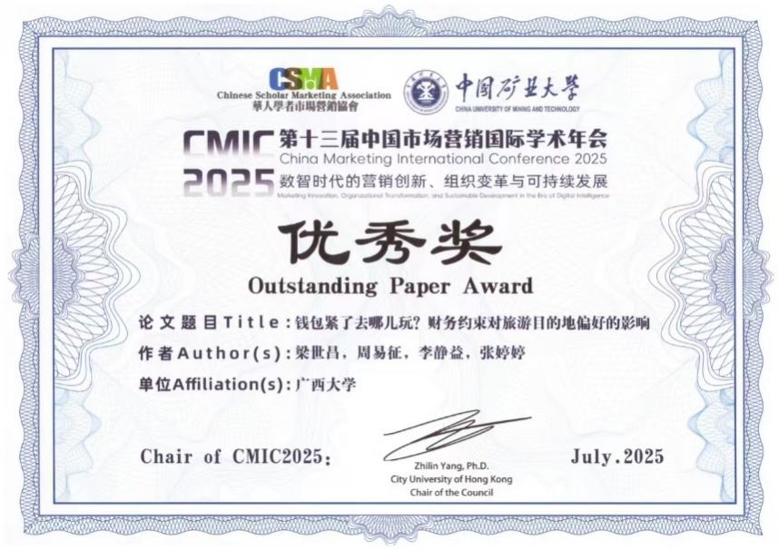 梁世昌副教授指导,2023级硕士研究生周易征、2022级硕士研究生李静益和张婷婷合作完成的论文《钱包紧了去哪儿玩?财务约束对旅游目的地偏好的影响》荣获“优秀奖”。