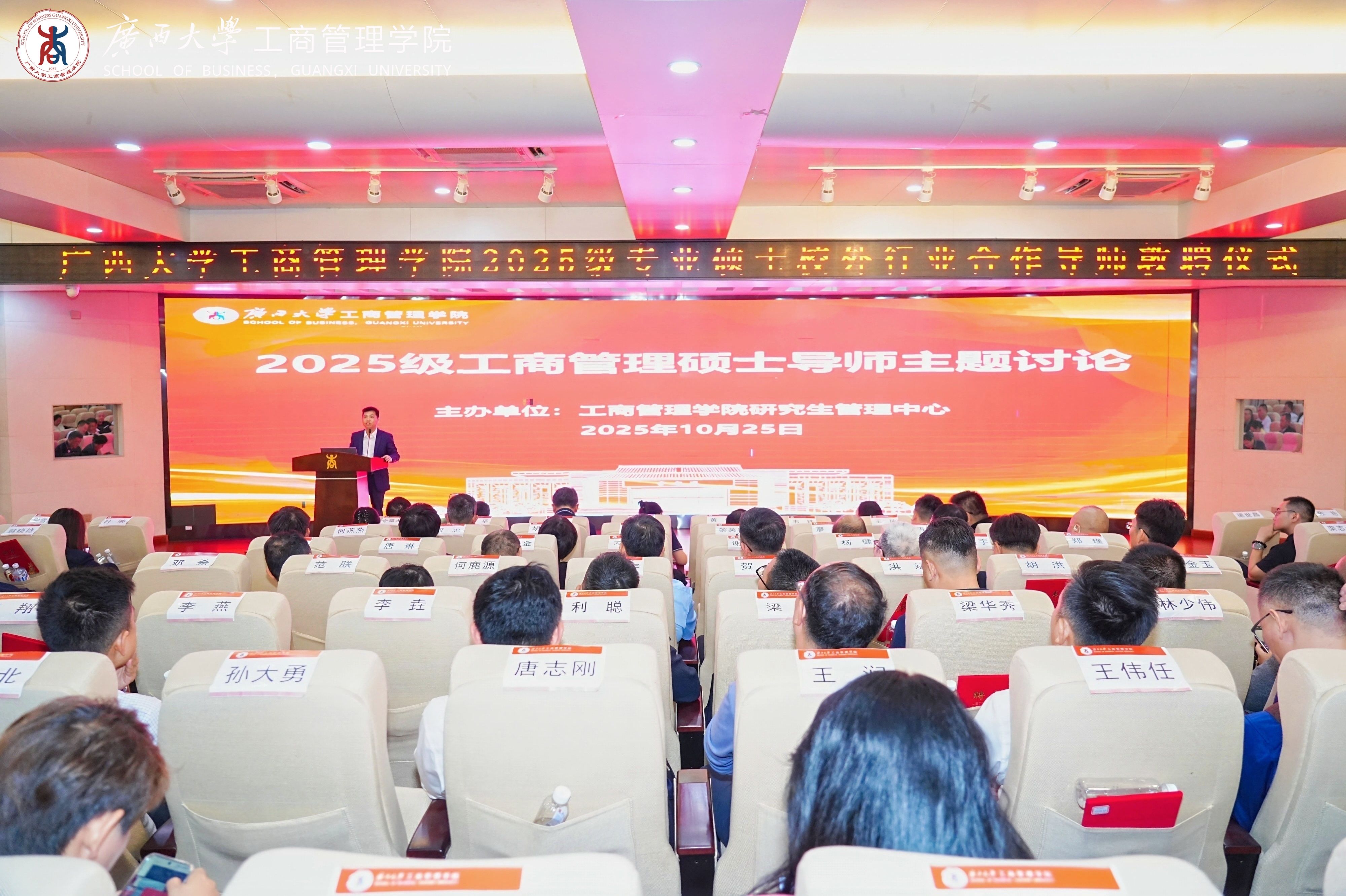 为加强校企合作,推动产学研深度融合,提升专业硕士培养质量,为学生搭建更广阔的职业发展平台,10月25日,学院在128报告厅举行2025级专业硕士校外行业合作导师敦聘仪式。学院党委书记黄晋、副院长韦铁,各专业硕士负责人、导师组组长、79名专业硕士合作导师代表出席活动。研究生管理中心主任、MBA教育中心主任叶映主持仪式。