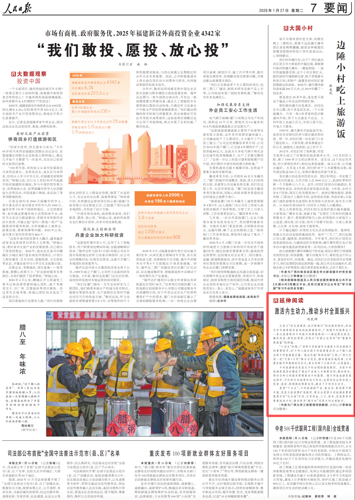 刘民坤教授科研团队接受《人民日报》采访,就深耕乡村文旅融合与消费升级规律提出独到见解,为广西乡村文旅业态创新、沉浸式体验打造、农旅消费扩容提质建言献策。(2026年01月27日第07版)刊载文章《激活内生动力,推动乡村全面振兴》,由记者李维俊采访整理,现将全文转载。