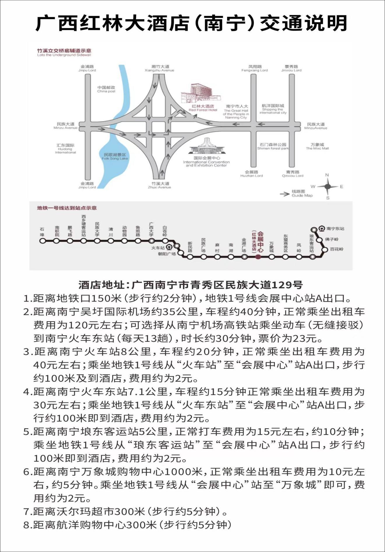 3.也可乘坐机场1 号专线(机场——南宁火车站),在火车站乘坐地铁1 号线,在鲁班路站下地铁,出地铁D 出口即是酒店。