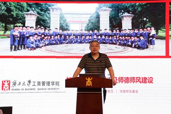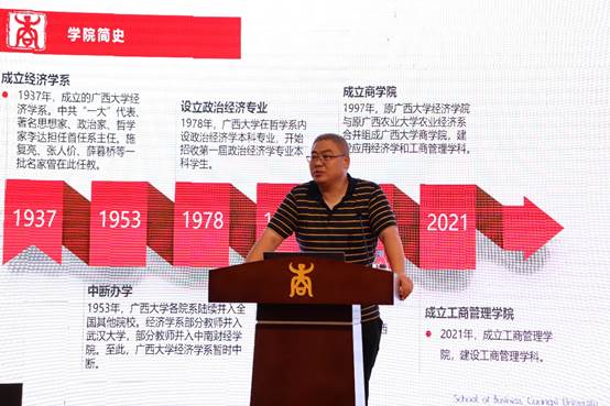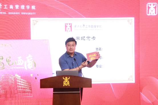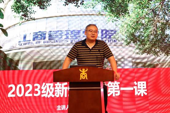的历史发展、师资力量、学科建设、学生工作、所获荣誉、校友成绩等方面展开了详细介绍。他强调商管新人要始终秉承“厚德、博学、创新、卓越”的学院价值观,用奋斗担当新使命,勤奋学习、砥砺奋进,为实现“跻身中国一流色中色
