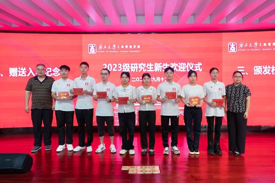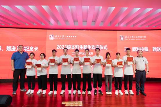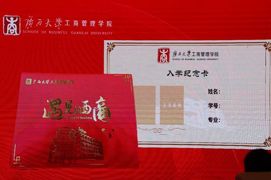 校徽以及入学纪念卡。为表达对新生们的热烈欢迎,学院特别为每一位新生都订制了精美的“遇见西商”入学纪念卡。每张纪念卡上记录着新生的姓名、专业、学号,以及一张入学时的相片,为新生留下深刻美好的入学回忆。在全体新生的见证下,院领导为新生代表赠送校徽、入学纪念卡,意味着他们已成为光荣的“西商人”,是他们永不褪色的标签,传递了老师们对新生的殷切希望、憧憬与希冀。