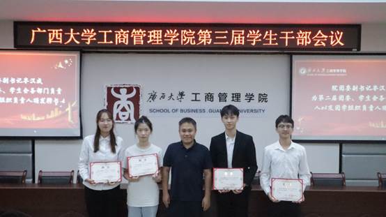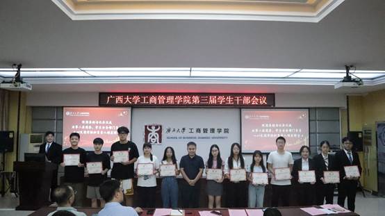 于学院124教室,召开第三届全体学生干部会议。院党委副书记黄晋、院团委书记马丽娟、院团委副书记岑汉成、院学生辅导员莫秀德、郁文丹出席本次会议。