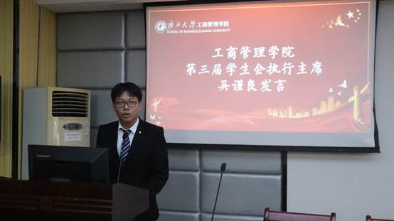 会议进行到第四项议程:第三届学生会主席团执行主席吴谨良上台发言。他带头承诺第三届学生干部将不断勇担重任,锐意进取,积极响应学生会改革的号召,在各项活动中推进学院的繁荣进步。为此他向在场学生干部提出倡议:要树立责任意识,提高思想觉悟;要加强组织联系,不断提升政治意识;要提高服务意识,在奉献中实现自身价值;要勤学好问善思,做新时代五好青年。