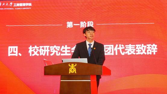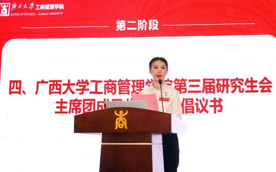 第三届研究生主席团代表覃周瑶宣读倡议书,并向全院青年研究生发出如下倡议:一、强调政治意识,强化思想建设;二、坚持知行合一,扎根商科之学;三、勇于砥砺前行,彰显青春风采;四、恪守正道严守底线原则,锤炼品行修为。最后,她呼吁同学们行动起来,以“今日之我,胜昨日之我”的青春朝气,既怀抱梦想又脚踏实地,立志成为新时代好青年,为色中色