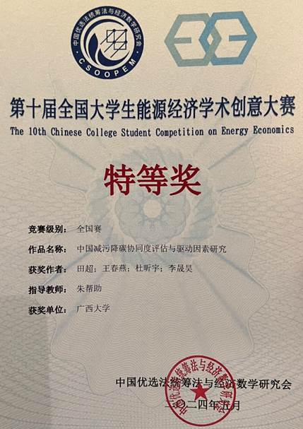 朱帮助教授带领的研究生团队在此次竞赛中脱颖而出,取得佳绩。其中,“中国减污降碳协同度评估与驱动因素研究”(团队队长:田超,指导老师:朱帮助)入围全国总决赛,经过现色中色
