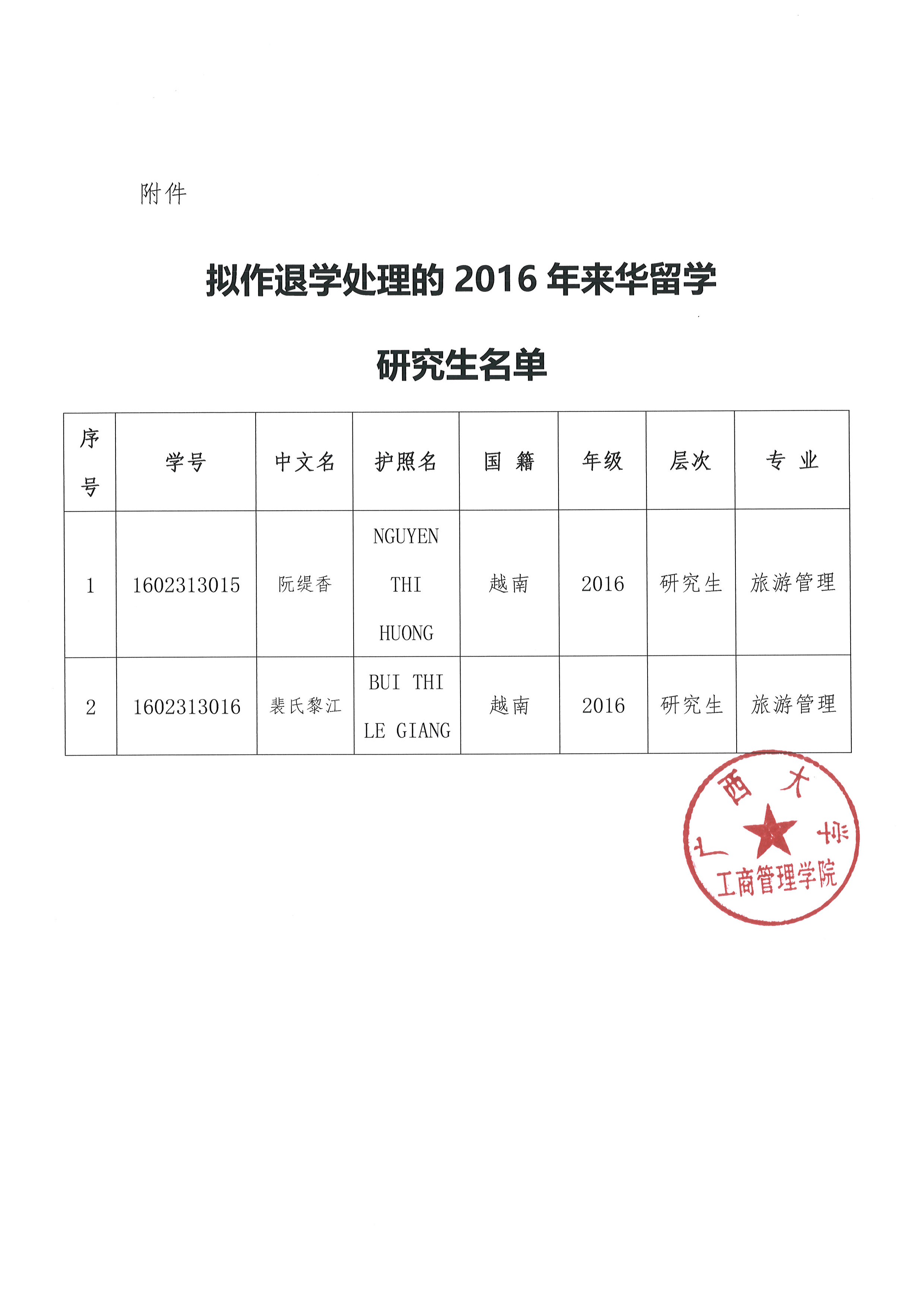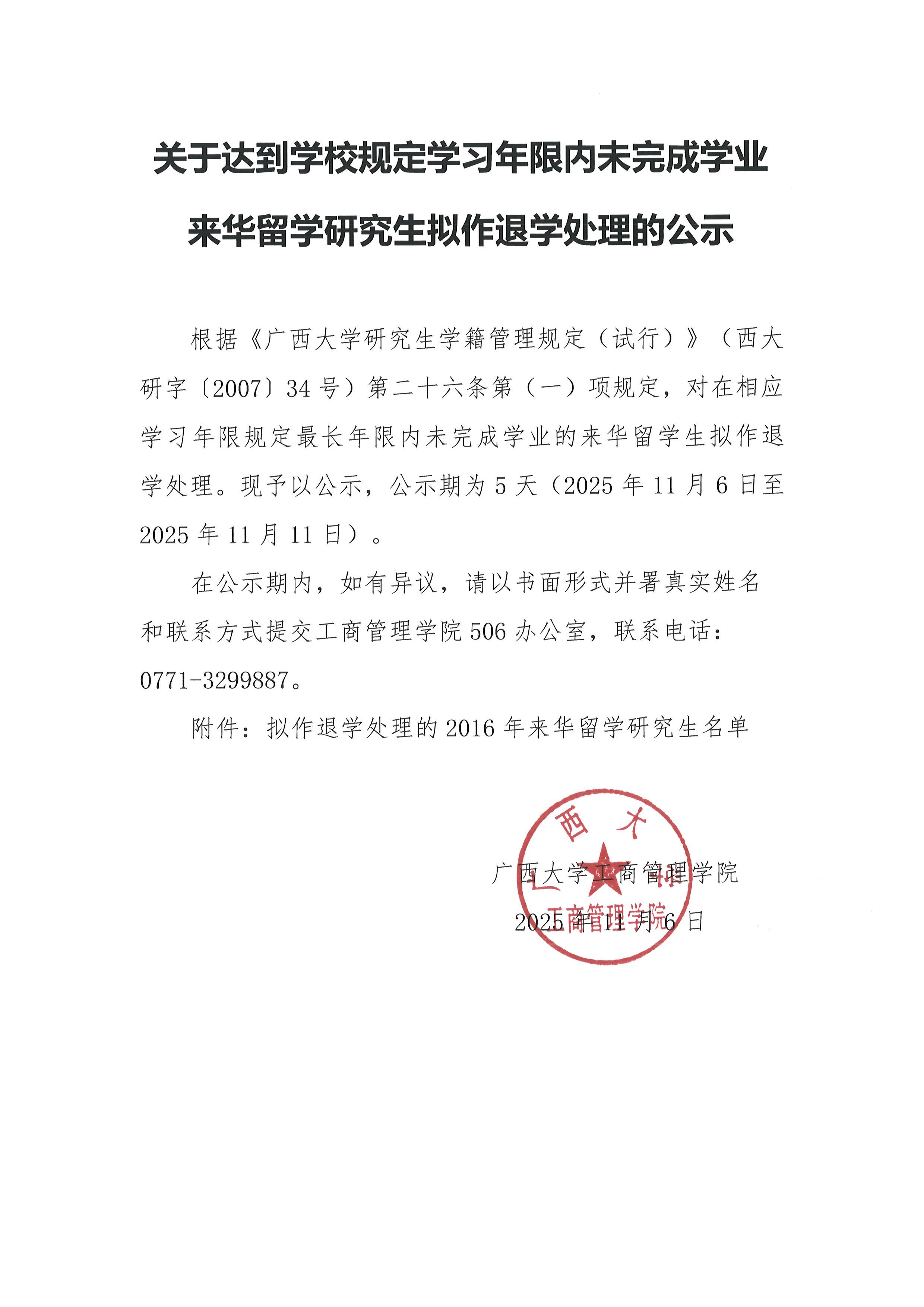 关于达到学校规定学习年限内未完成学业来华留学研究生拟作退学处理的公示