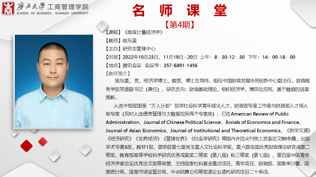2022级博士和学术型硕士研究生讲授《高级计量经济学》。受疫情影响,此次课堂以线上授课的方式进行,色中色