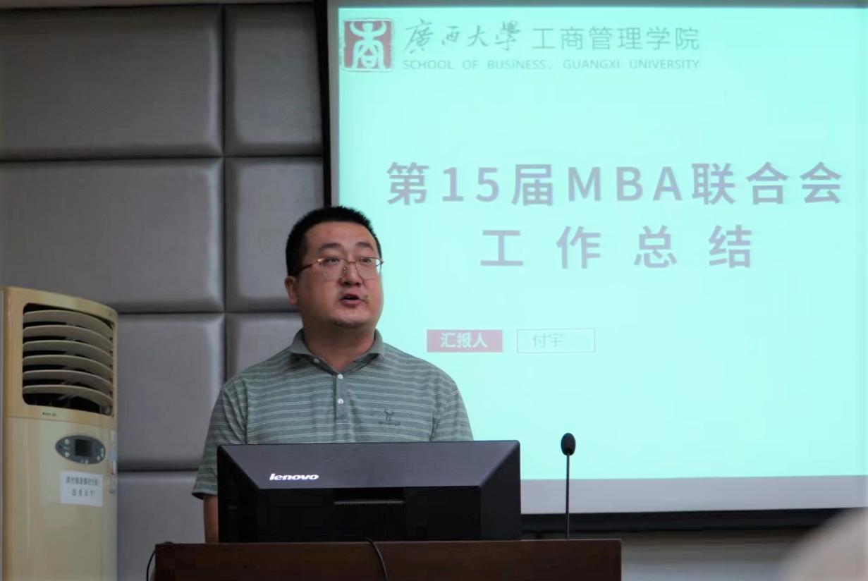 第十五届MBA联合会主席付宇作年度工作报告。在报告中,付宇主席对联合会过去一年的工作做了全面的总结及汇报。在联合会主席团的带领下,联合会的成员们集智创新,举办了各类形式丰富的活动,丰富了同学们课外生活以及帮助同学们拓展了商业知识。并感谢这一年多来为联合会各项活动奔走忙碌的成员们以及对始终默默支持联合会活动的老师、同学们和学长学姐们。他希望新一届的MBA联合会主席团能不负重托,为扩大色中色