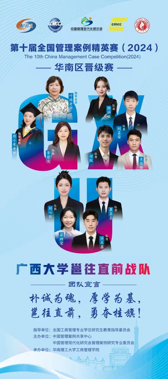 副院长朱少英、MBA教育中心主任叶映和熊小果老师的悉心指导与带领下,学院精心组建了一支由九名才华横溢的学员构成的参赛队伍,他们满怀激情地参与了第十届全国管理案例精英赛华南赛区的晋级竞赛,展现了色中色