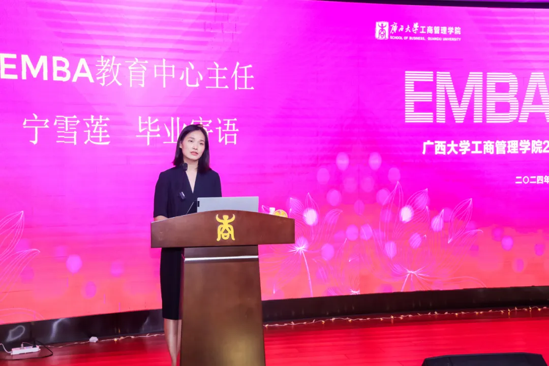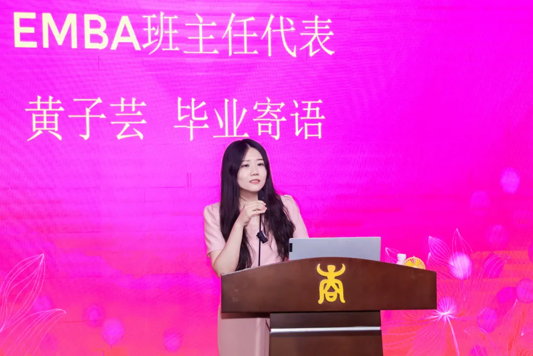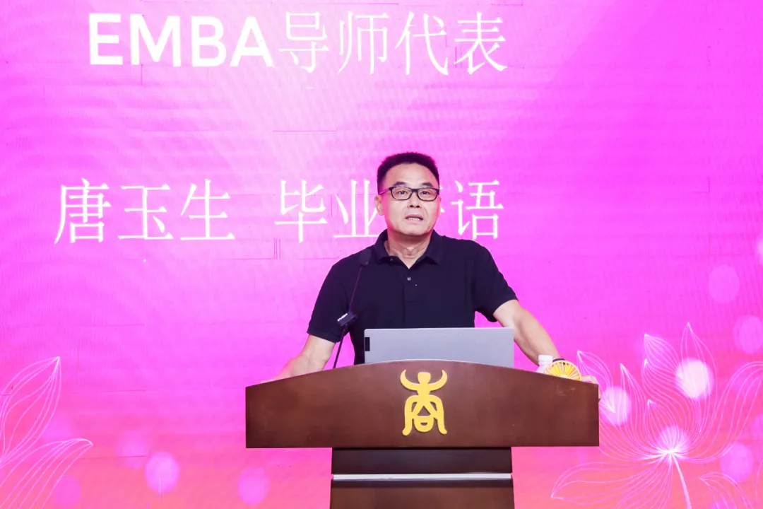 导师代表唐玉生、覃朝勇、EMBA教育中心主任宁雪莲、EMBA班主任代表黄子芸、邓丹分别为EMBA毕业生作毕业寄语,表达了对同学们深深的情感与不舍。