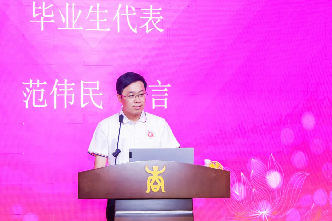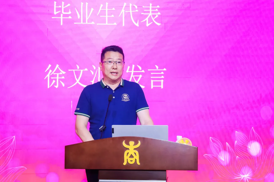 毕业生代表EMBA23班范伟民向同学们送上由衷的祝福,对尊敬的老师,致以诚挚的感谢。他表示,通过EMBA课程学习,更加明白了商道的本质和重要性。他祝愿同学们带着珍重和向往,开启下一个精彩的人生篇章。