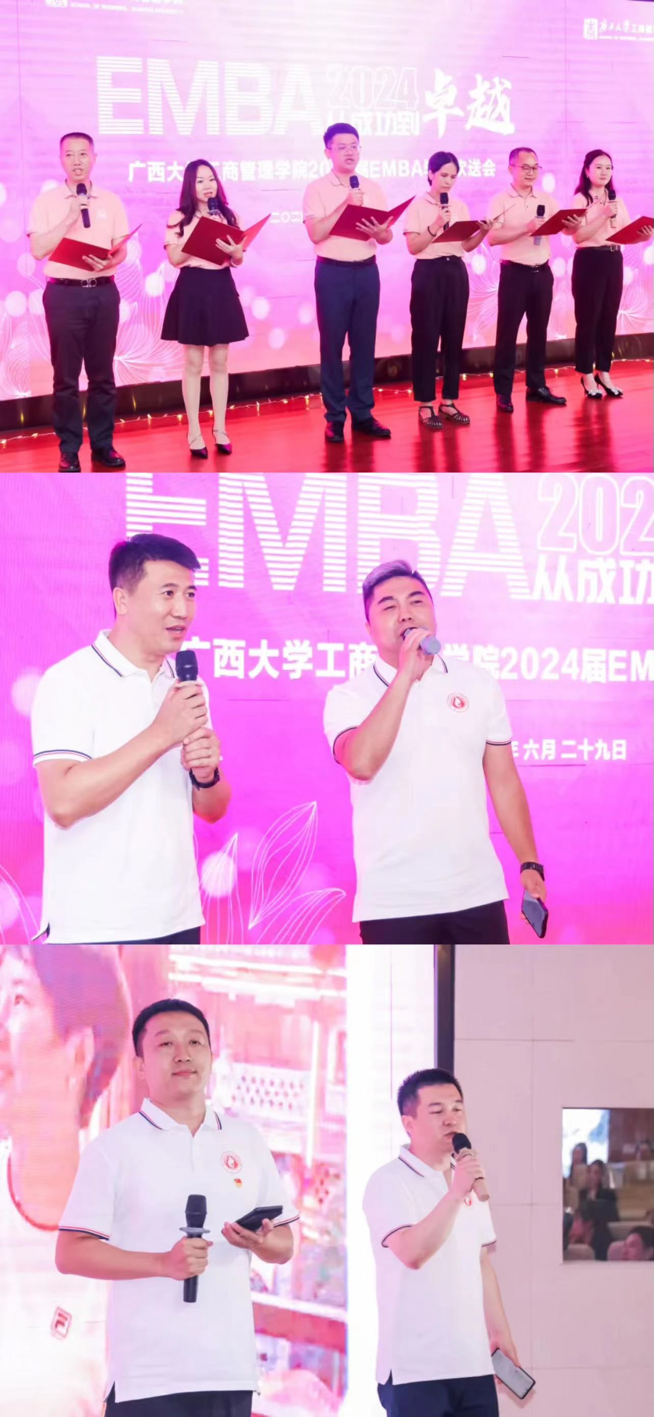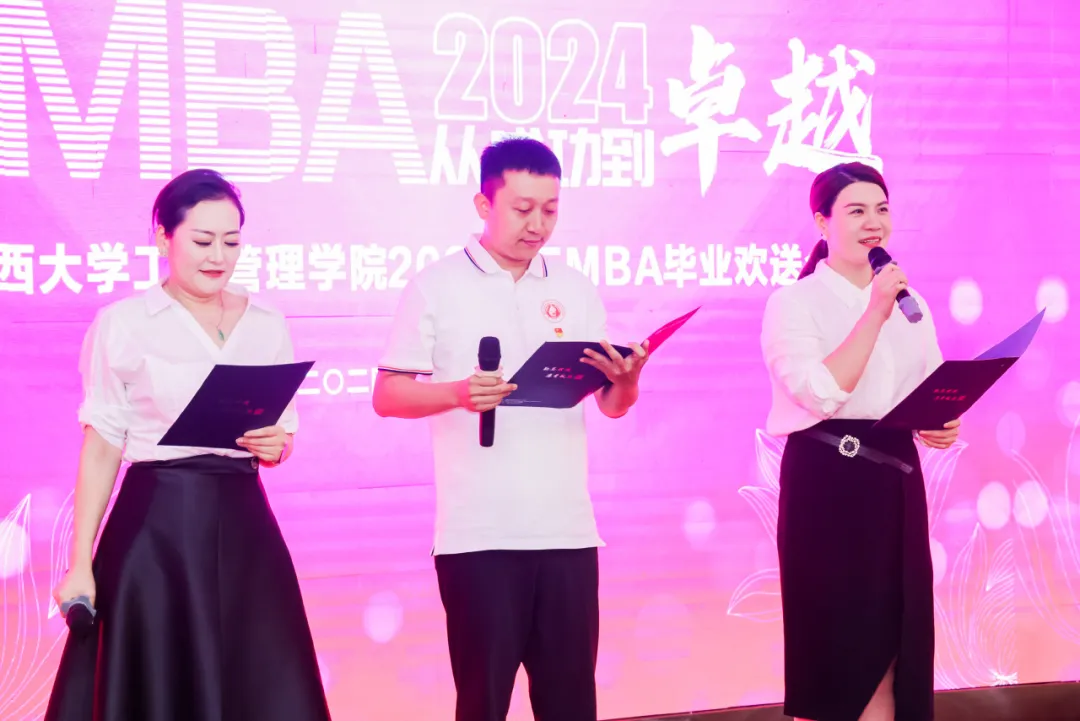 党委副书记肖克宁、副院长朱少英、申韬、刘民坤、廖东红,导师代表唐玉生、覃朝勇等老师出席了欢送会,共同为此次毕业的EMBA同学庆祝。此次欢送会由EMBA21班周艳、EMBA22班居香、EMBA23班陆宏亮主持。