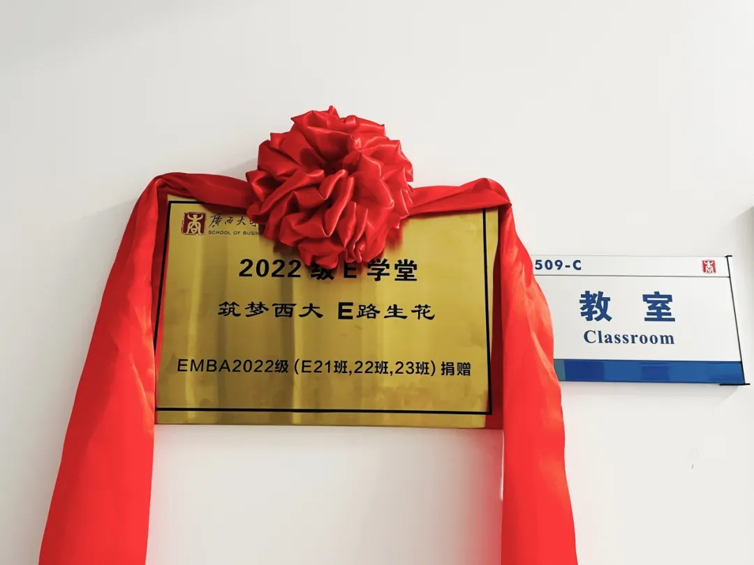毕业欢送会开始之前,朱少英副院长,EMBA21班班长龙毅、22班班长徐文汇、23班班长范伟民共同为2022级EMBA同学冠名捐赠的509C教室揭牌,欢送会现场的老师和同学们通过直播形式,观看、见证了揭牌仪式。“2022级E学堂——筑梦西大,E路生花”,不仅承载着22级EMBA同学们对未来的美好憧憬和祝福,更展现了同学们对母校的感恩和关怀。
