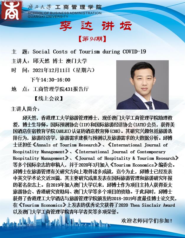 色中色 “李达讲坛”【第94期】:Social Costs of Tourism during COVID-19