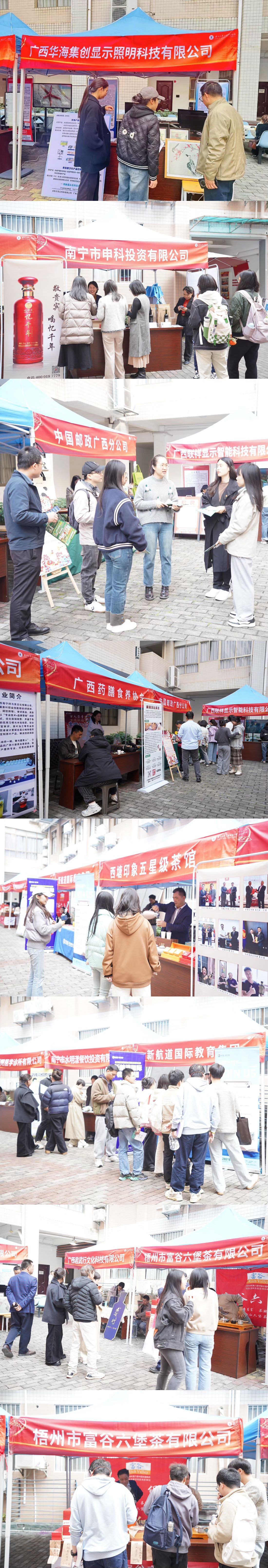 此次校友企业形象展示与招聘活动得到了来自各行各业校友企业的大力支持,涵盖了教育、旅游、养生、茶文化、医疗、口腔、智能科技等多个领域。广西旅发文化旅游股份有限公司通过现场产品演示与色中色讲解,不仅让师生和校友们了解了行业前沿动态,还让大家亲身体验了一些文创非遗产品,如绣球、壮锦、虎头帽等,别具一格,拓宽了视野。中国邮政广西分公司带来了茉莉花奶茶,清新雅致的茉莉花香与丝滑的鲜奶相融合,每一口都洋溢着幸福的味道,深受现场欢迎。三亩山农业发展有限公司带来了康顺山茶籽系列洗护用品,山茶油富含维生素E和不饱和脂肪酸,深层滋养头发,改善干枯毛糙问题,使头发更加柔顺亮泽,备受师生喜爱。卫君睡眠医学诊所有限公司展示了一款纯植物精油喷雾,现场讲解了睡眠的重要性及促进有效睡眠的方法,吸引了不少关注。新航道国际教育集团与同学们近距离互动,激发了许多同学对未来职业规划的兴趣,提供了宝贵的学习机会。广西爱生多维长寿口腔科技有限公司推出的益生菌口服含片压片糖果,不仅能清新口腔,还能促进肠道蠕动,帮助消化。广西联祥显示智能科技有限公司展示了多款LED显示器、3D照片展示屏等高科技产品,其中闺蜜机随身屏因其强大功能和时尚外观成为全场焦点。广西药膳食养协会现场讲解食物养生之道,并支持更多毕业生创业。南宁市水明漾餐饮投资有限公司专注于婚庆服务,提供了多个就业岗位。广西龙云山茶业集团有限公司带来了明星产品——有机茶与有机奶的独特奶茶,茶香与奶甜的完美融合,深受欢迎。南宁申科酒庄和忆千年酱香白酒也展示了多款红酒与白酒。广西南宁持与茶文化有限公司、梧州市富谷六堡茶有限公司、广西君武行文化科技有限公司、西塘印象五星级茶馆等企业则现场展示了茶艺文化及品茶服务。