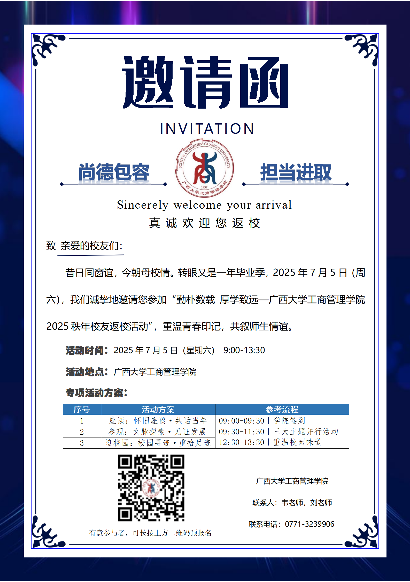 若您有意向于2025年7月5日(周六)上午参加秩年校友返校活动,请扫描上方二维码填写相关资料,以便我们及时联络您。