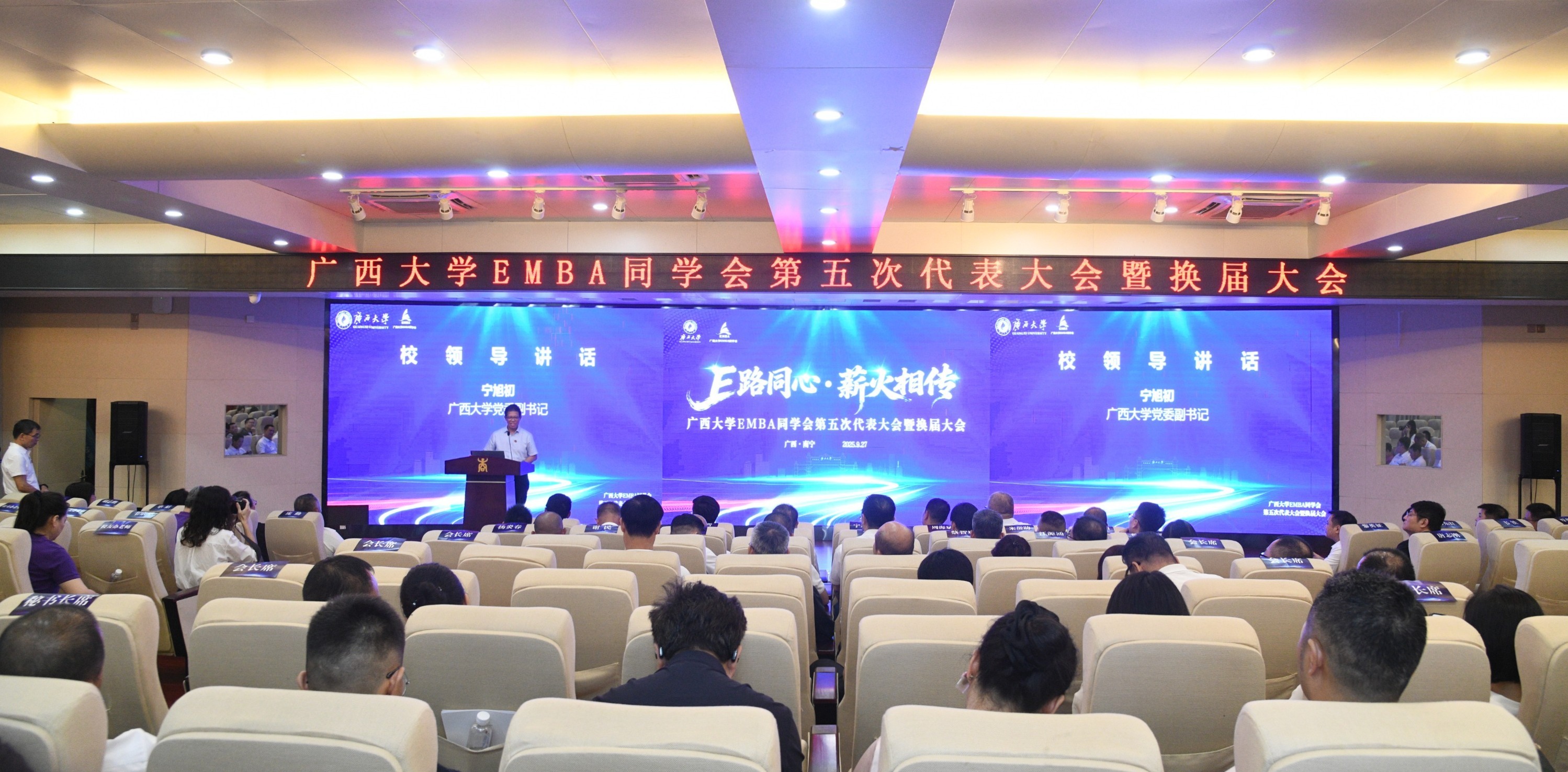 校党委副书记宁旭初在讲话中代表学校向EMBA校友长期以来对母校的关心和支持表示衷心感谢。他与校友们分享了学校在融入国家和区域发展战略、增强服务广西经济社会发展效能上取得的重大标志性成果,并强调校友是母校宝贵的财富,是推动学校高质量发展的重要力量。宁副书记对校友会发展提出三点希望:一要严守意识形态阵地,筑牢思想引领根基,以校史校训为精神内核,汇聚起向上向善的校友力量;二要凝聚校友合力,共筑发展共同体,形成校友学校双向价值共创的良性循环;三要聚焦服务赋能,提升校友价值,为壮美广西建设贡献西大力量。
