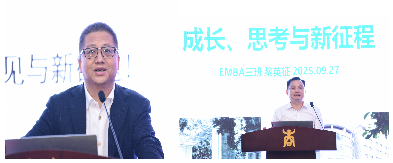 论坛现场,EMBA 三班校友、环球新材国际控股有限公司董事局主席兼行政总裁苏尔田,以 “三个十年” 为叙事主线,分享了自己从乡村青年到跨国企业掌舵者的蜕变历程。他深刻指出,“技术远见、资本布局与人才战略,是企业穿越周期、持续成长的核心动力”。其掌舵的环球新材,通过并购韩国 CQV、德国默克表面业务,已跃居全球珠光材料行业的领军者,生动诠释了“新材料没有天花板”的无限赛道。EMBA三班校友、广西英伦信息技术股份有限公司董事长黎英征,则以“成长、思考与新征程” 为题,结合自身华为工作经历与创业实践,分享了对企业经营的深度洞察。他提出的 “站在未来看现在”“相信概率、尊重周期” 等务实观点,精准击中企业家实践中的痛点,引发在场校友强烈共鸣,不少人现场记录观点、举手追问细节,互动氛围热烈。