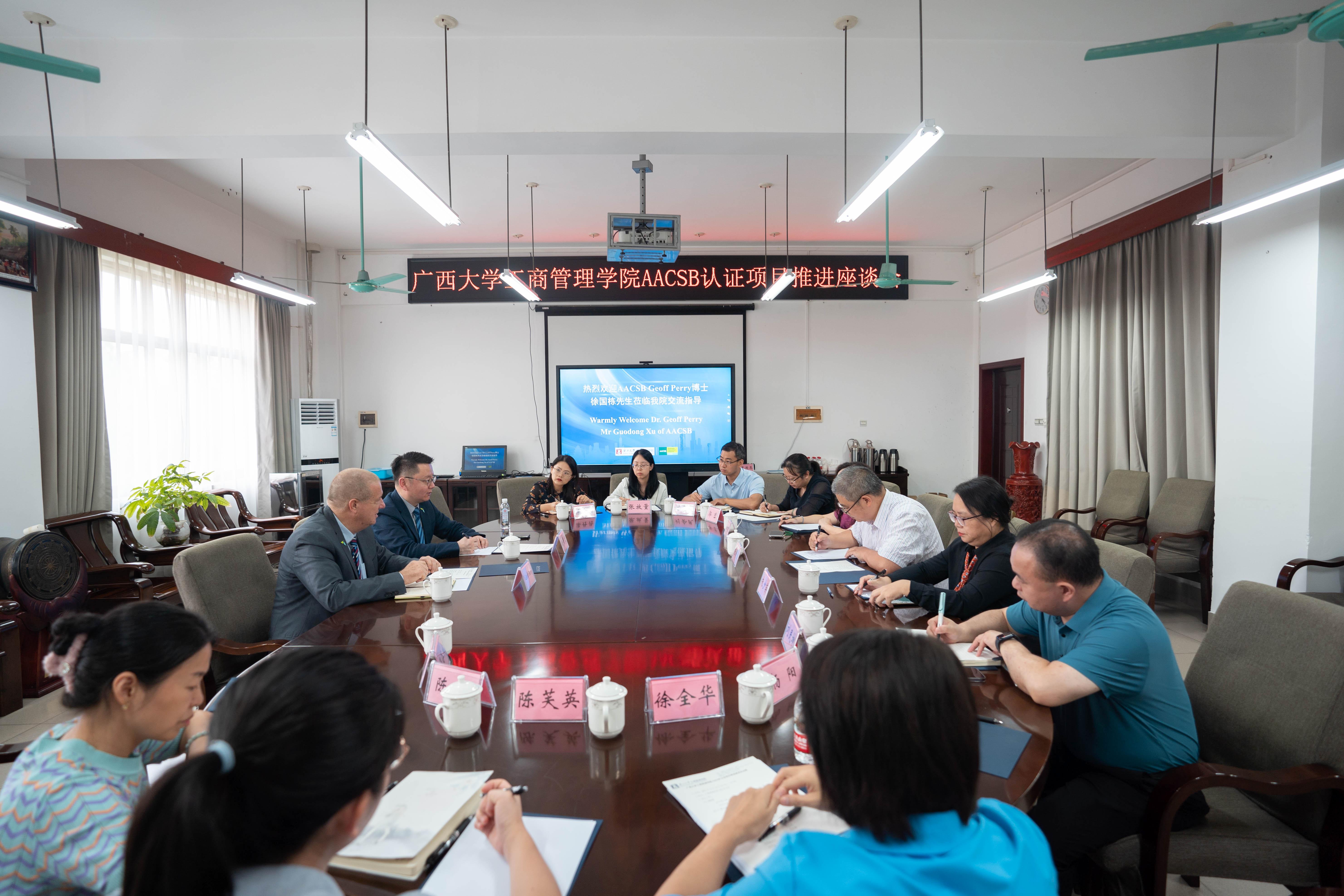 领导及相关部门负责人就AACSB认证项目相关工作进行了探讨。Geoff Perry副总裁和徐国栋先生对学院的发展情况进行了深入了解,对AACSB认证的标准进行了更深入的解读,回答了学院领导及系、办负责人的问题,为加快学院AACSB认证工作出谋划策。