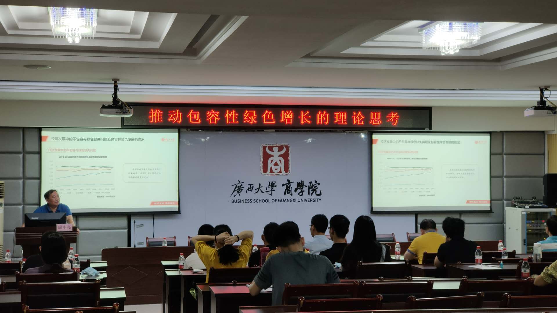 进行学术交流。上午8点30分,周小亮教授在商学院124报告厅进行了主题为“推动包容性绿色增长的理论思考”的学术报告。报告由商学院学术院长李光辉教授主持。