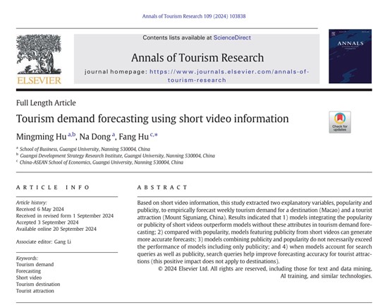 副教授胡明明、硕士研究生董娜与经济学院胡芳博士合作撰写的《Tourism Demand Forecasting Using Short Video Information》学术论文在旅游管理国际高水平期刊《Annals of Tourism Research》在线发表。《Annals of Tourism Research》是JCR分区Q1区期刊,中科院1区TOP期刊,ABS四星期刊,2023年影响因子为10.4。