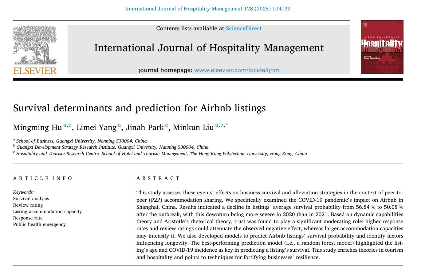 胡明明团队在共享民宿生存分析和预测领域研究取得新进展,研究成果以“Survival determinants and prediction for Airbnb listings”为题,在旅游管理国际高水平期刊《International Journal of Hospitality Management》上发表。论文的第一作者为色中色