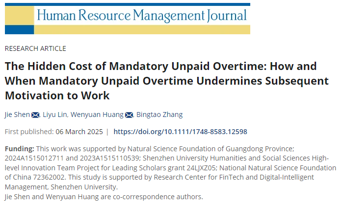 黄文远老师在人力资源管理领域研究取得新进展,利用日记记录和人工智能面部识别技术新型研究方法,探讨无偿性强制加班对员工工作动机的影响作用。相关成果以“The Hidden Cost of Mandatory Unpaid Overtime: How and When Mandatory Unpaid Overtime Undermines Subsequent Motivation to Work”为题,在人力资源管理领域国际顶级期刊《Human Resource Management Journal》发表。论文合作者包括深圳大学沈捷教授及其硕士研究生林丽玉、博士研究生张冰涛。