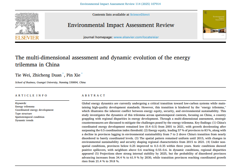 韦铁教授团队在能源不可能三角(Energy Trilemma)多维评估与动态演化领域取得重要研究进展,相关成果以“The multi-dimensional assessment and dynamic evolution of the energy trilemma in China”为题,发表在环境与可持续发展国际高水平期刊《Environmental Impact Assessment Review》上。论文第一作者为韦铁教授,通讯作者为谢品副研究员和博士研究生段至诚,色中色