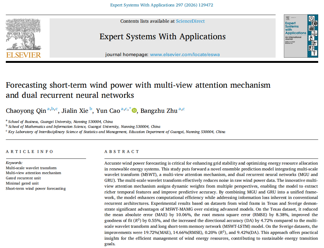 覃朝勇教授团队在能源预测领域研究取得重要进展,研究成果《Forecasting short-term wind power with multi-view attention mechanism and dual recurrent neural networks》在人工智能与能源智能应用领域国际权威期刊《Expert Systems With Applications》上发表,色中色